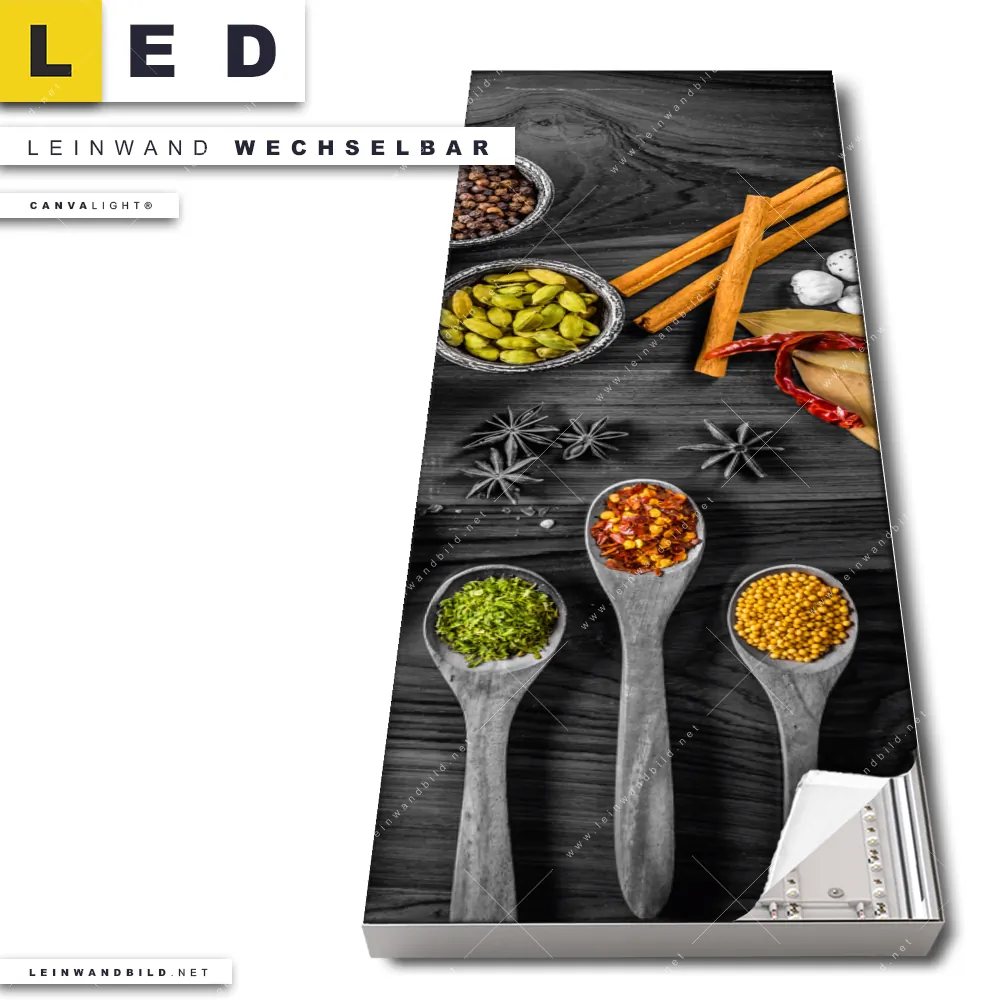 Dann sollte das LED Leinwandbild Canvalight® TEX | Kräutermischung | Schmal den Weg zu Dir finden. Das stufenlos dimmbare Leinwandbild Gewürzvielfalt auf Löffeln und in Schälchen im steckerfertigen Leuchtrahmen mit Fernbedienung und optionaler Farbtemperatursteuerung fügt sich als Eye-Catcher harmonisch in jedes Bar - Gastronomie, Küche - Esszimmer Raumkonzept ein.