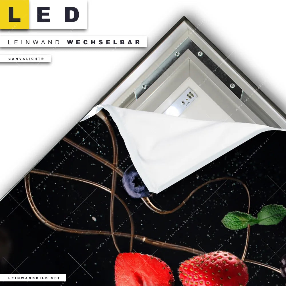 Du bist auf der Suche nach einem Essen - Trinken LED Leinwandbild im Hochformat? Begriffe wie Obst, Früchte, frisch, spritzig, Spritzer, Tropfen, Schokolade, Kuchen, Himbeeren, Blaubeeren, Erdbeeren haben Dich auf der Suche nach Deinem neuen XXL LED Wandbild mit wechselbarer Leinwand inspiriert? Farben wie Bunt, Schwarz, Lila, Rot dürfen auf Deinem neuen Leinwand-LED-Bild nicht fehlen und Leuchtbilder im Mixed Media, Modern Art Stil passen perfekt zu Deinem Einrichtungsstil?