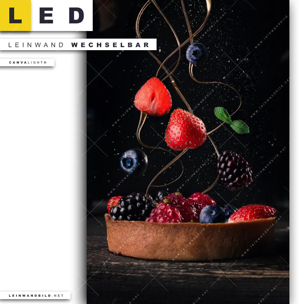 Du konfigurierst Dein individuelles LED Leinwandbild Canvalight® TEX | Kuchen mit frischen Beeren | Hochformat und wir produzieren es NEU für Dich. Unsere Essen - Trinken LED Bilder mit wechselbarer Textil-Leinwand sind KEINE Lagerware. Du bist Dir unsicher, welches Motiv oder Format das richtige für dein individuelles Canvalight® Leuchtbild ist, dann helfen wir dir gerne weiter und beraten dich!