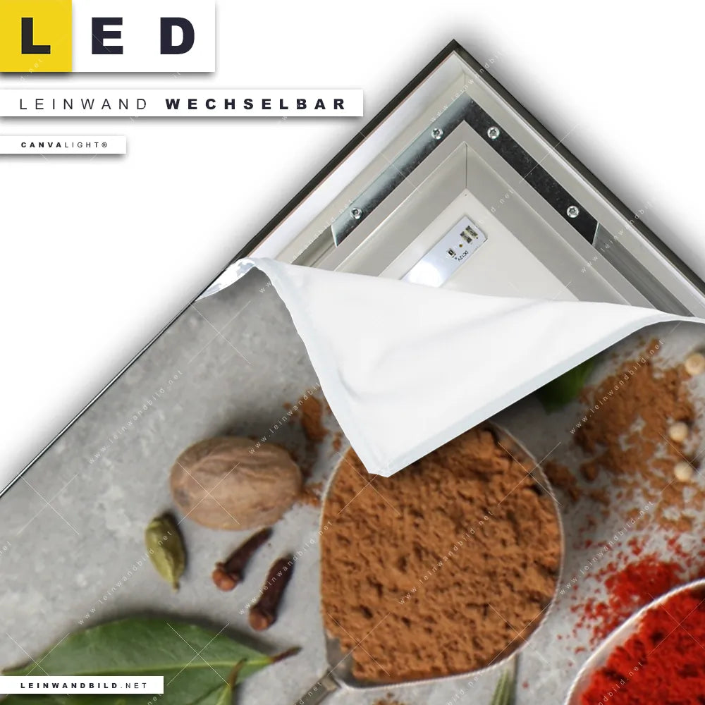 Du konfigurierst Dein individuelles LED Leinwandbild Canvalight® TEX | Silberlöffel mit Gewürzen | Schmal und wir produzieren es NEU für Dich. Unsere Essen - Trinken LED Bilder mit wechselbarer Textil-Leinwand sind KEINE Lagerware. Du bist Dir unsicher, welches Motiv oder Format das richtige für dein individuelles Canvalight® Leuchtbild ist, dann helfen wir dir gerne weiter und beraten dich!