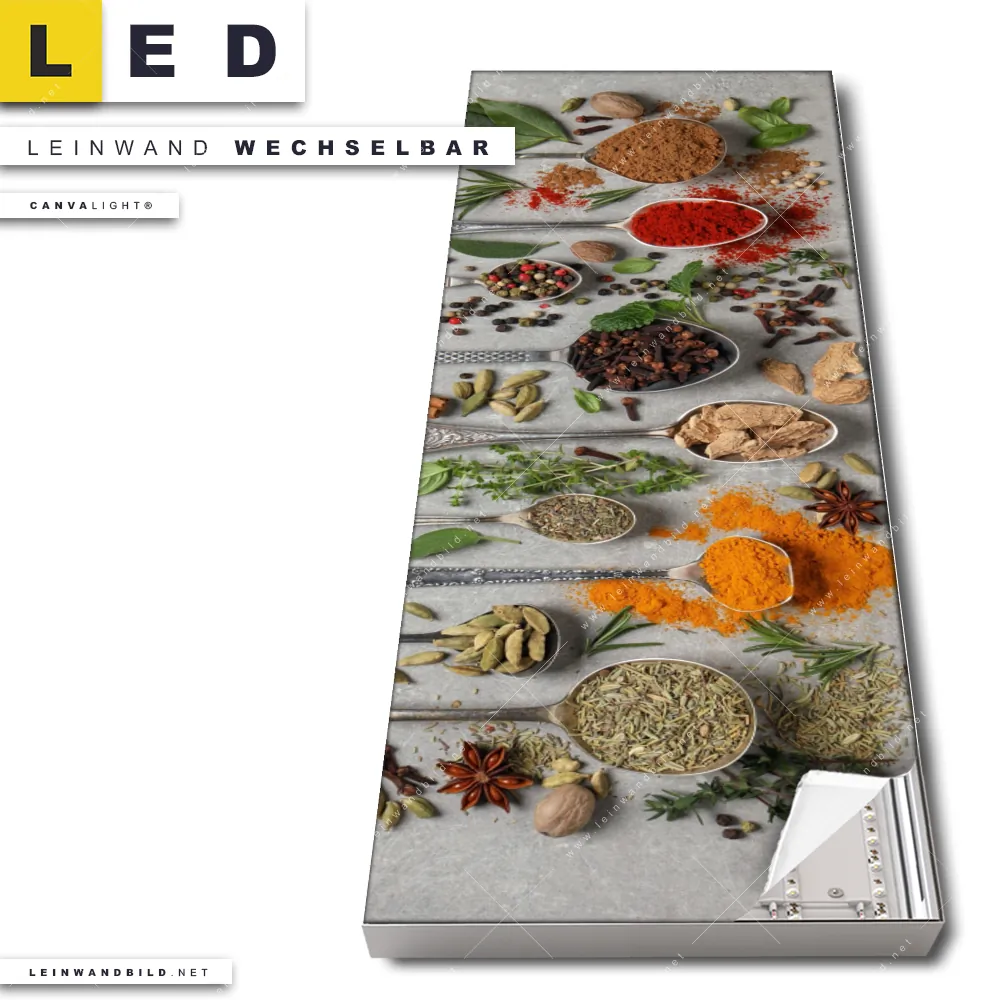 Du bist auf der Suche nach einem Essen - Trinken LED Leinwandbild im Schmalen Format? Begriffe wie Gewürze, Kräuter, Löffel, kochen, Silberlöffel, Lebensmittel, frisch, lecker, gesund haben Dich auf der Suche nach Deinem neuen XXL LED Wandbild mit wechselbarer Leinwand inspiriert? Farben wie Bunt, Schwarz dürfen auf Deinem neuen Leinwand-LED-Bild im Panorama-Hochformat nicht fehlen und Leuchtbilder im Modern Art, Natürlich - Realistisch Stil passen perfekt zu Deinem Einrichtungsstil?