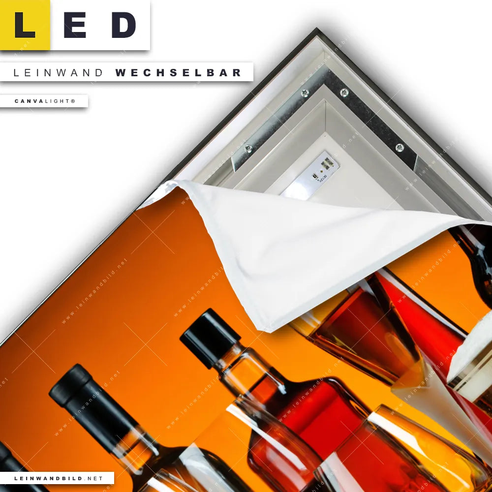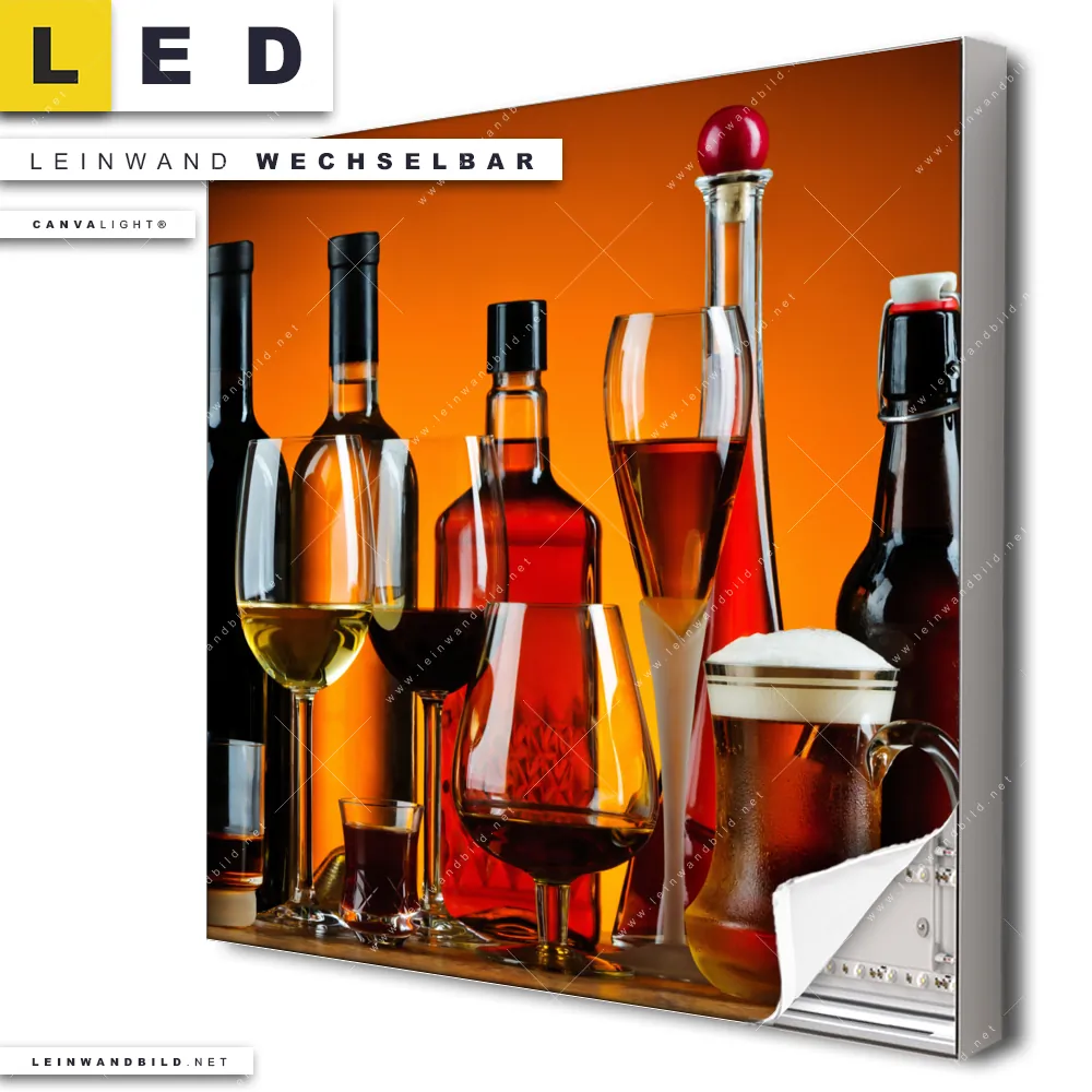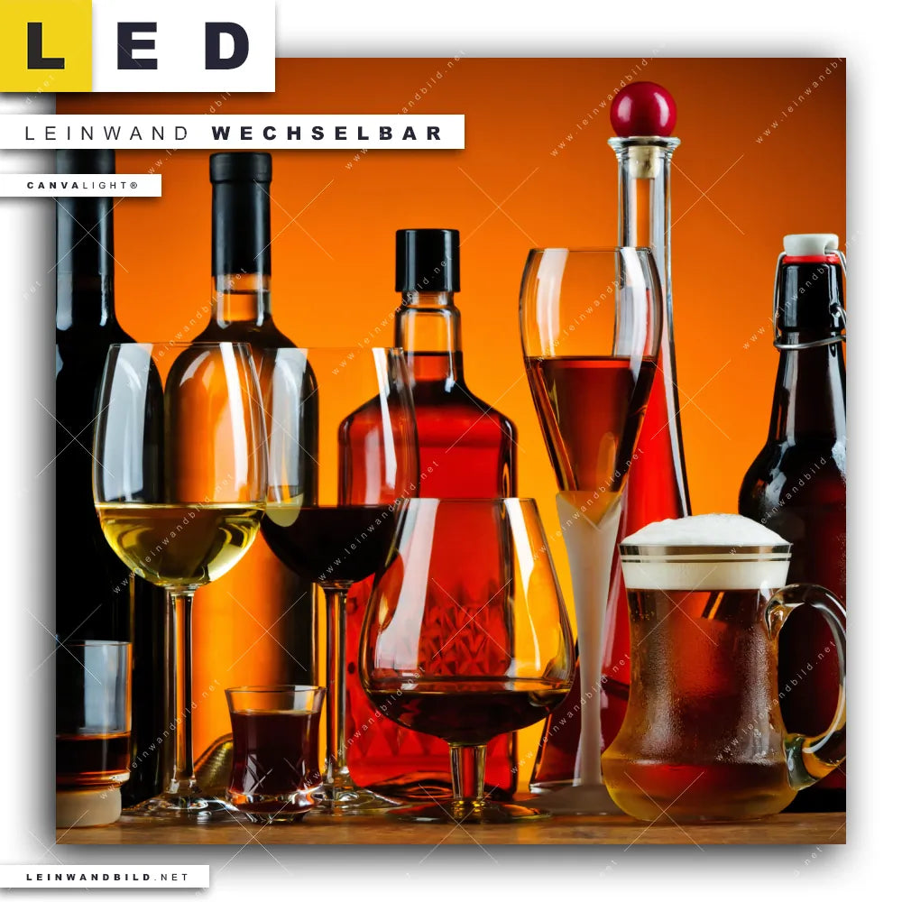 Du bist auf der Suche nach einem Essen - Trinken LED Leinwandbild im Quadratischen Format? Begriffe wie Flaschen, Glas, Getränke, Wein, Whiskey, Bier, Cognac, Likör, Alkohol haben Dich auf der Suche nach Deinem neuen XXL LED Wandbild mit wechselbarer Leinwand inspiriert? Farben wie Gold, Orange, Rot dürfen auf Deinem neuen Leinwand-LED-Bild nicht fehlen und Leuchtbilder im Natürlich - Realistisch Stil passen perfekt zu Deinem Einrichtungsstil?
