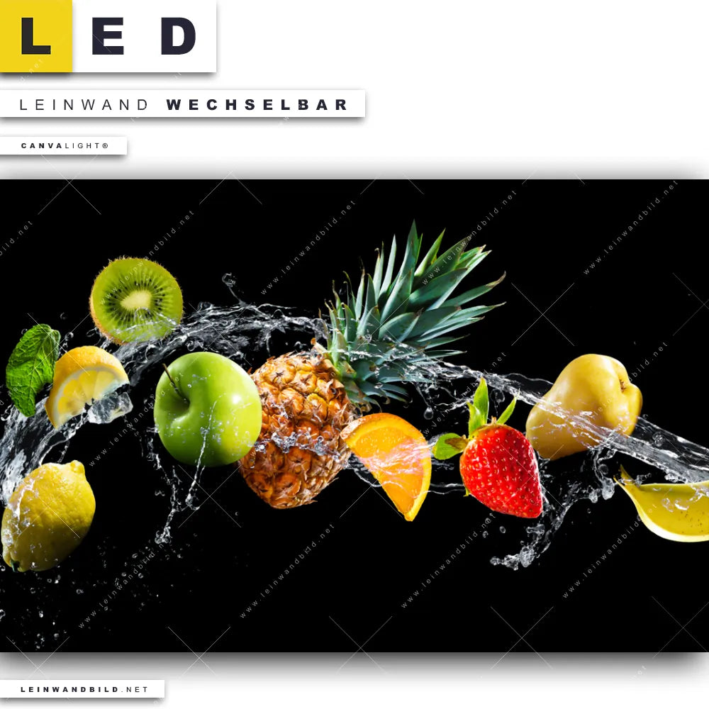 Du bist auf der Suche nach einem Essen - Trinken LED Leinwandbild im Querformat? Begriffe wie Obst, Zitrusfrüchte, Früchte, Kiwi, frisch, spritzig, Banane, Ananas, Spritzwasser, Wasser, Spritzer, Kokosnuss, Tropfen, Wassertropfen haben Dich auf der Suche nach Deinem neuen XXL LED Wandbild mit wechselbarer Leinwand inspiriert? Farben wie Bunt, Schwarz dürfen auf Deinem neuen breiten Leinwand-LED-Bild nicht fehlen und Leuchtbilder im Mixed Media, Modern Art Stil passen perfekt zu Deinem Einrichtungsstil?