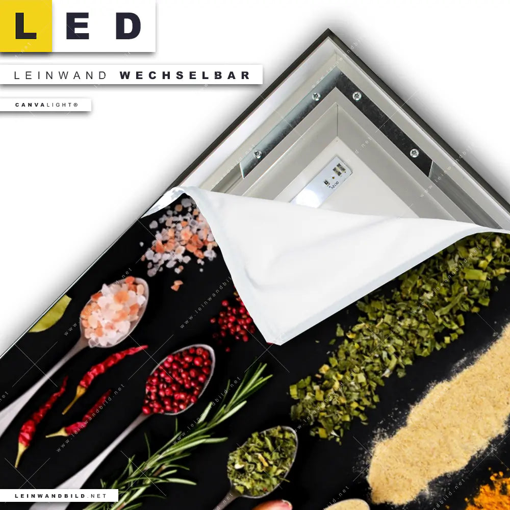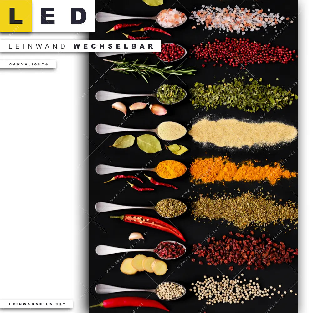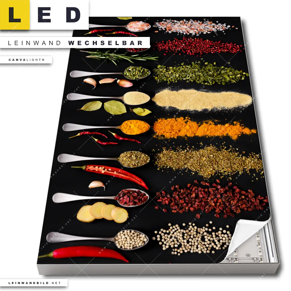 Du konfigurierst Dein individuelles LED Leinwandbild Canvalight® TEX | Vielfalt an exotischen Gewürzen | Hochformat und wir produzieren es NEU für Dich. Unsere Essen - Trinken LED Bilder mit wechselbarer Textil-Leinwand sind KEINE Lagerware. Du bist Dir unsicher, welches Motiv oder Format das richtige für dein individuelles Canvalight® Leuchtbild ist, dann helfen wir dir gerne weiter und beraten dich!