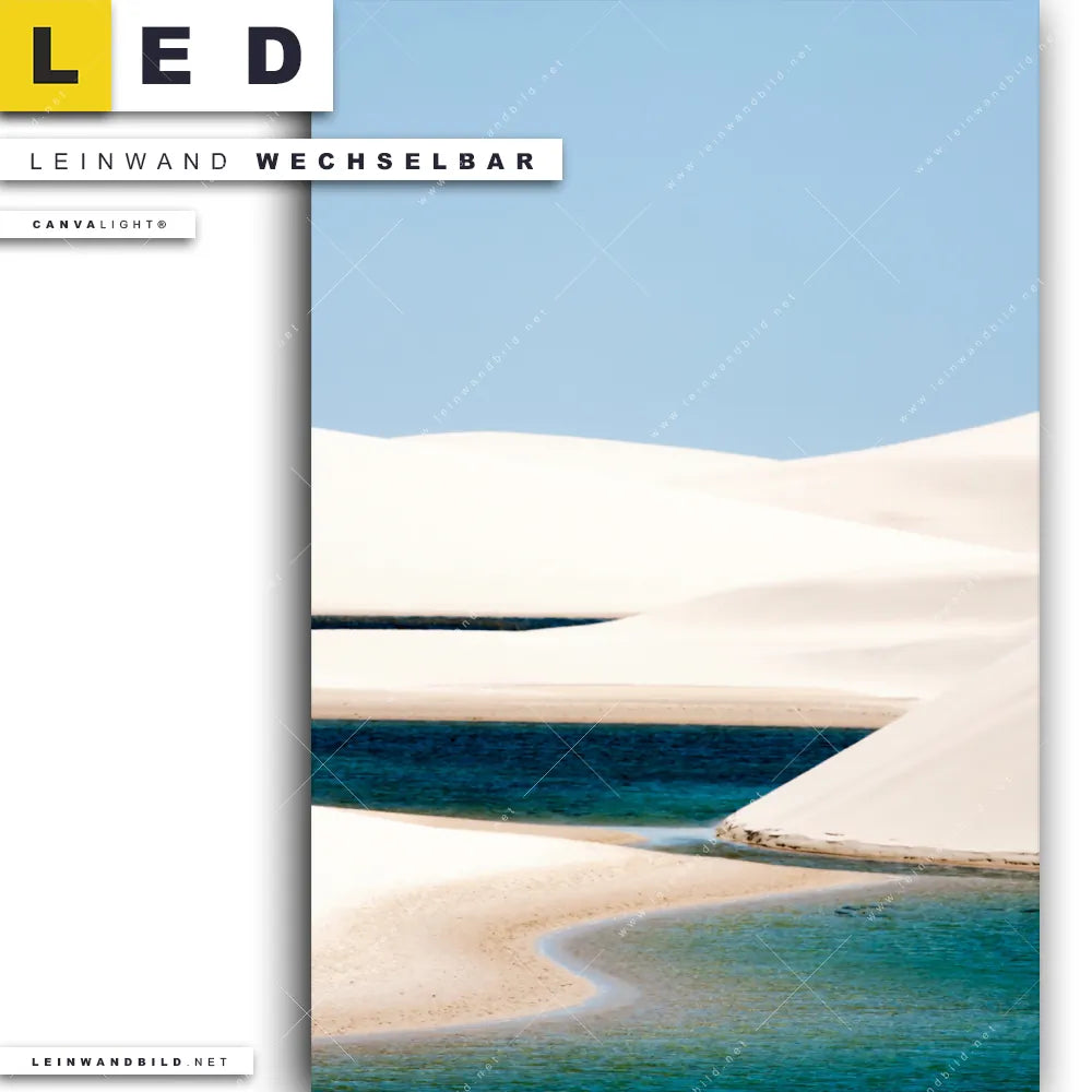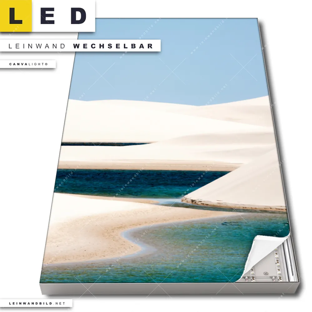 Du konfigurierst Dein individuelles LED Leinwandbild Canvalight® TEX | Sanddünen und Seen | Hochformat und wir produzieren es NEU für Dich. Unsere Landschaften LED Bilder mit wechselbarer Textil-Leinwand sind KEINE Lagerware. Du bist Dir unsicher, welches Motiv oder Format das richtige für dein individuelles Canvalight® Leuchtbild ist, dann helfen wir dir gerne weiter und beraten dich!
