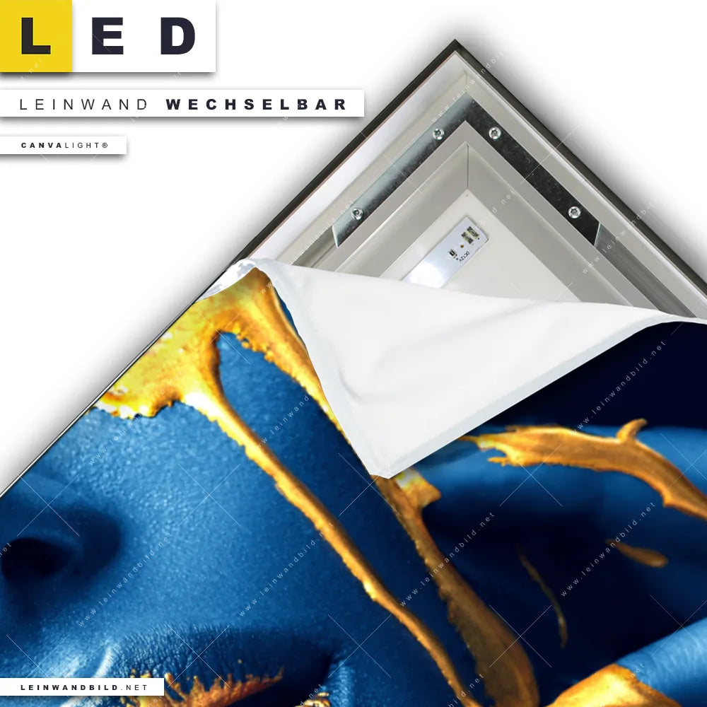Dann sollte das LED Leinwandbild Canvalight® TEX | Blaue Schönheit | Querformat den Weg zu Dir finden. Das stufenlos dimmbare Leinwandbild Verführung in Blau-Gold im steckerfertigen Leuchtrahmen mit Fernbedienung und optionaler Farbtemperatursteuerung fügt sich als Eye-Catcher harmonisch in jedes Bar - Gastronomie, Friseur - Beauty, Wohnzimmer - Schlafzimmer Raumkonzept ein.