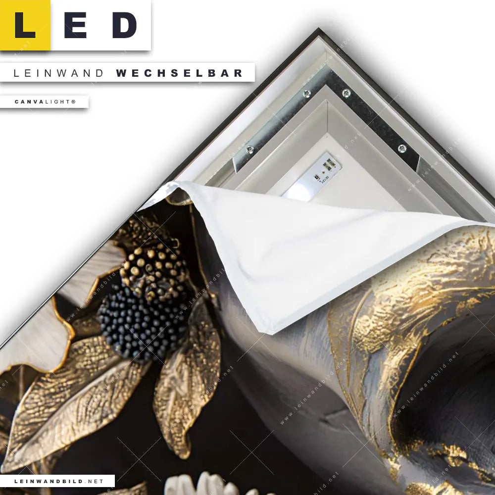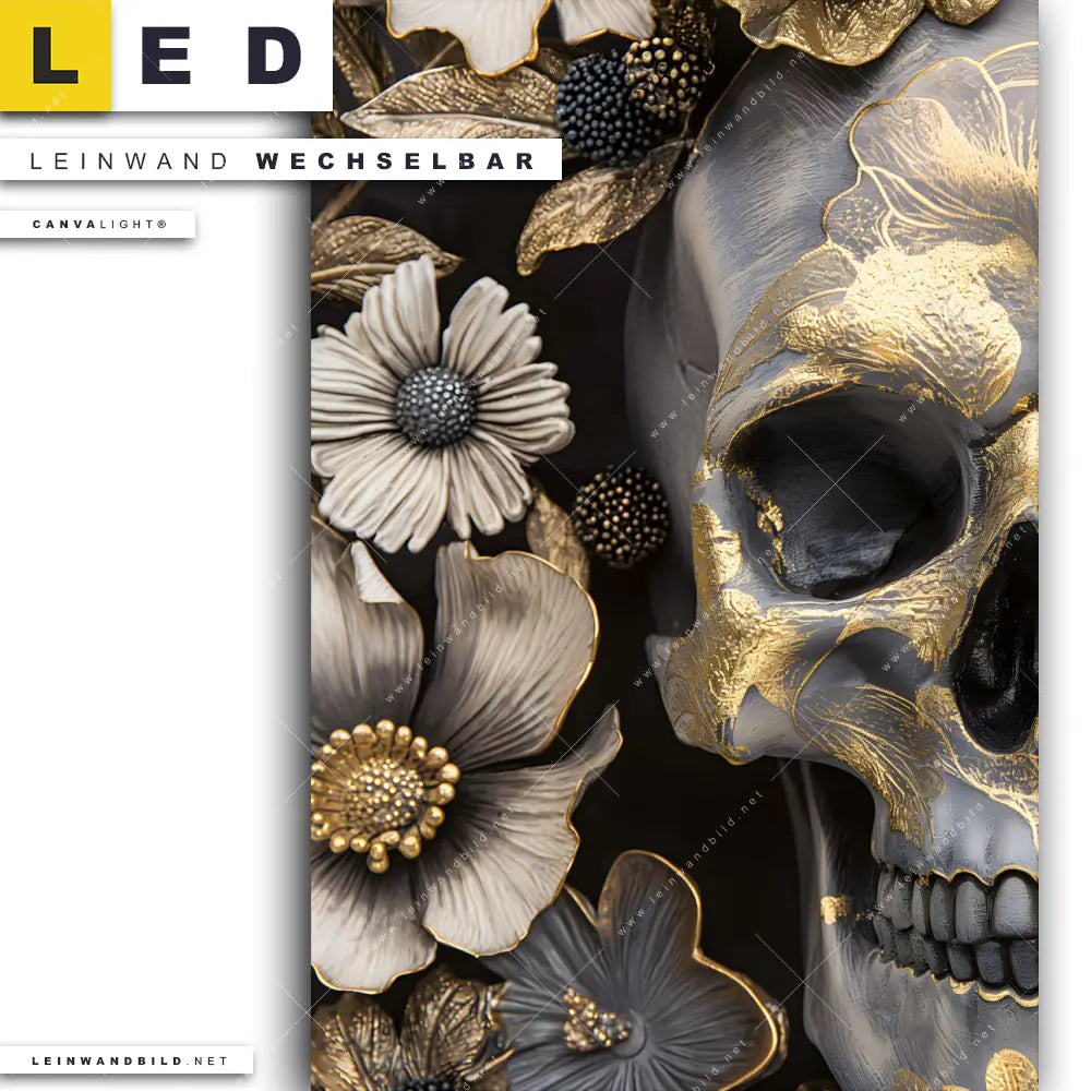 Du bist auf der Suche nach einem Porträts - Menschen, Blumen - Botanik LED Leinwandbild im Hochformat? Begriffe wie Schädel, Totenkopf, Skelett, Skull, Knochen, Blumen, Blüten, Blätter, Pflanzen, Kopf haben Dich auf der Suche nach Deinem neuen XXL LED Wandbild mit wechselbarer Leinwand inspiriert? Farben wie Gold, Schwarz, Weiss, Grau dürfen auf Deinem neuen Leinwand-LED-Bild nicht fehlen und Leuchtbilder im Floral, Modern Art Stil passen perfekt zu Deinem Einrichtungsstil?
