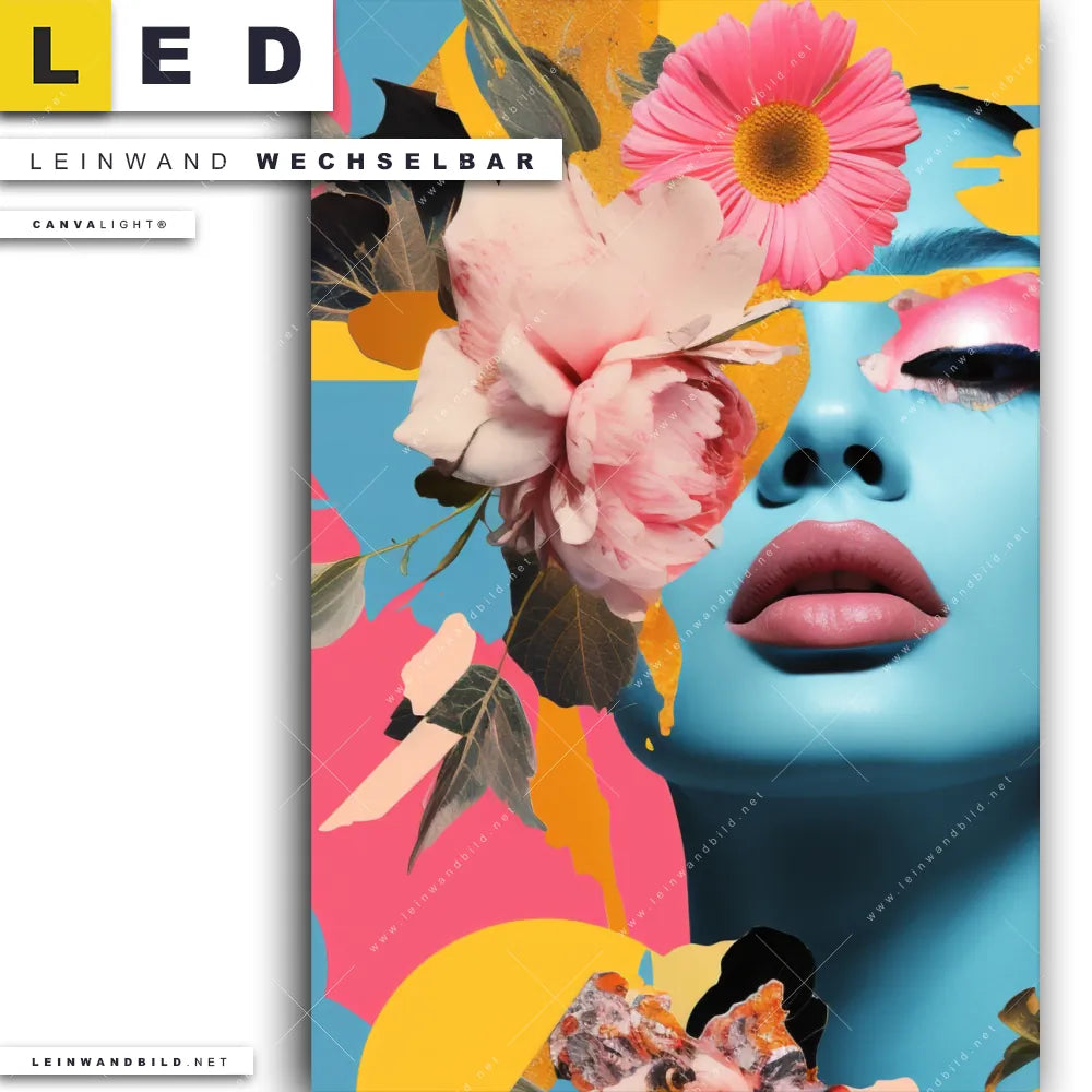 Du bist auf der Suche nach einem Porträts - Menschen, Blumen - Botanik LED Leinwandbild im Hochformat? Begriffe wie Menschen & Blumen, Frau, Porträt, Gesicht, Blumen, Blüten, Frisur, Haare haben Dich auf der Suche nach Deinem neuen XXL LED Wandbild mit wechselbarer Leinwand inspiriert? Farben wie Rot, Blau, Orange, Hellblau, Weiss dürfen auf Deinem neuen Leinwand-LED-Bild nicht fehlen und Leuchtbilder im Modern Art, Floral, Pop Art, Mixed Media Stil passen perfekt zu Deinem Einrichtungsstil?