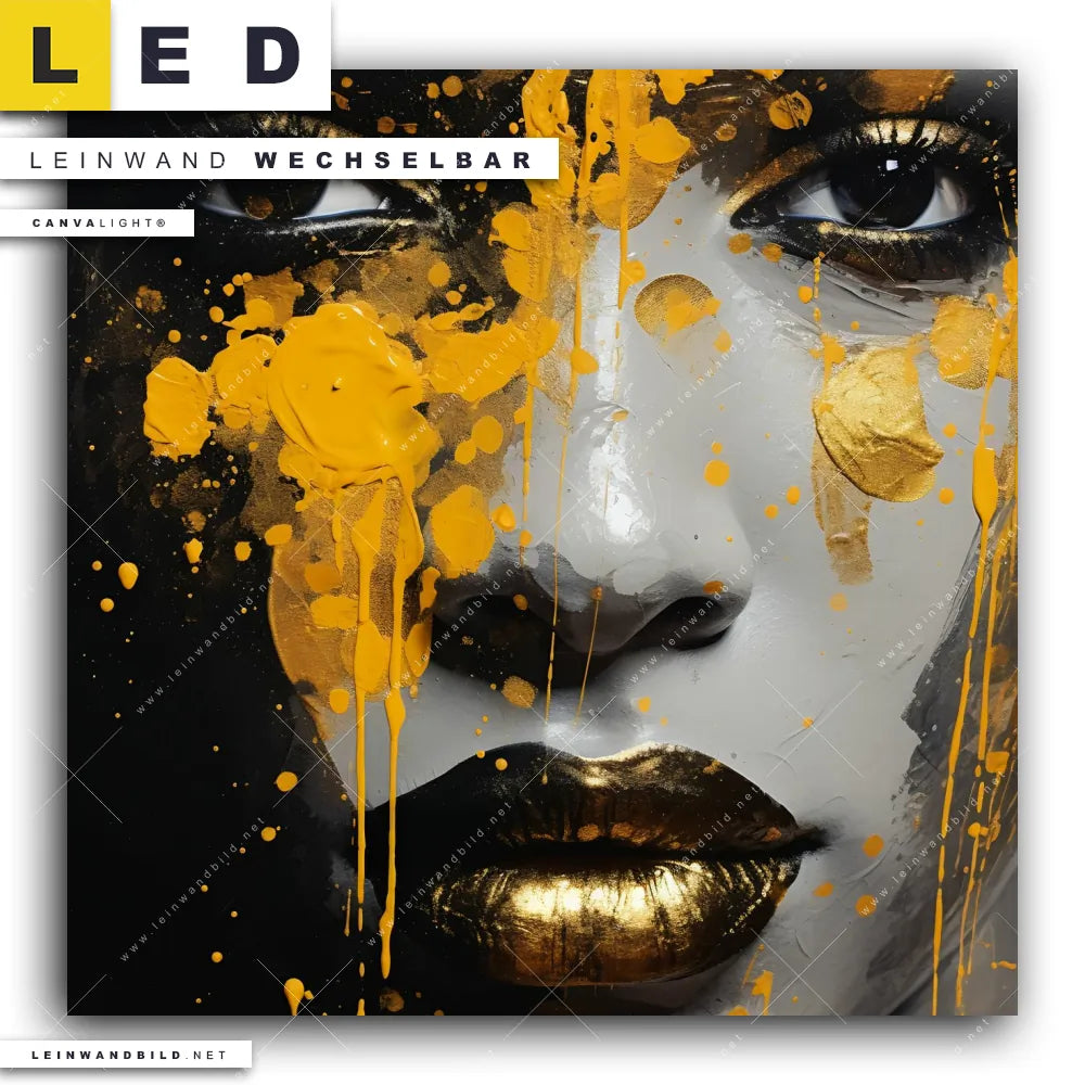 Du bist auf der Suche nach einem Porträts - Menschen LED Leinwandbild im Quadratischen Format? Begriffe wie Gesicht, Farbexplosion, Farbspritzer, Frau, Lippen, Beauty haben Dich auf der Suche nach Deinem neuen XXL LED Wandbild mit wechselbarer Leinwand inspiriert? Farben wie Gold, Orange, Schwarz dürfen auf Deinem neuen Leinwand-LED-Bild nicht fehlen und Leuchtbilder im Abstrakt, Modern Art Stil passen perfekt zu Deinem Einrichtungsstil?