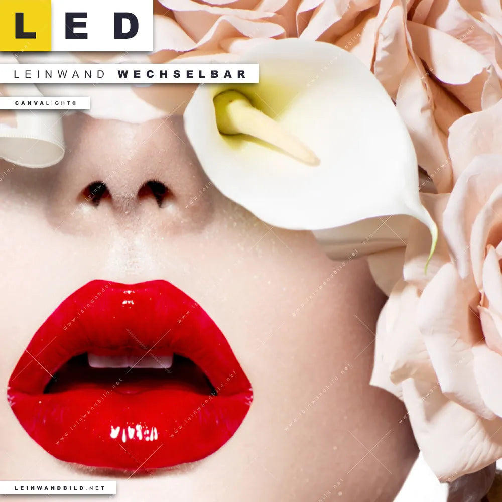 Du bist auf der Suche nach einem Porträts - Menschen, Blumen - Botanik LED Leinwandbild im Hochformat? Begriffe wie Menschen & Blumen, Frau, Porträt, modern, Beauty, Gesicht, Blumen, Blüten, Schönheit, Mode, Lippen haben Dich auf der Suche nach Deinem neuen XXL LED Wandbild mit wechselbarer Leinwand inspiriert? Farben wie Beige, Weiss, Rot dürfen auf Deinem neuen Leinwand-LED-Bild nicht fehlen und Leuchtbilder im Modern Art, Floral Stil passen perfekt zu Deinem Einrichtungsstil?
