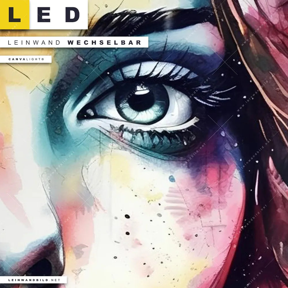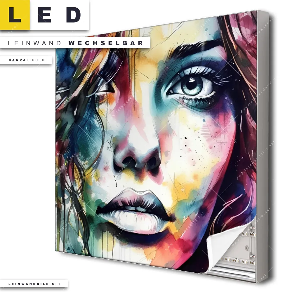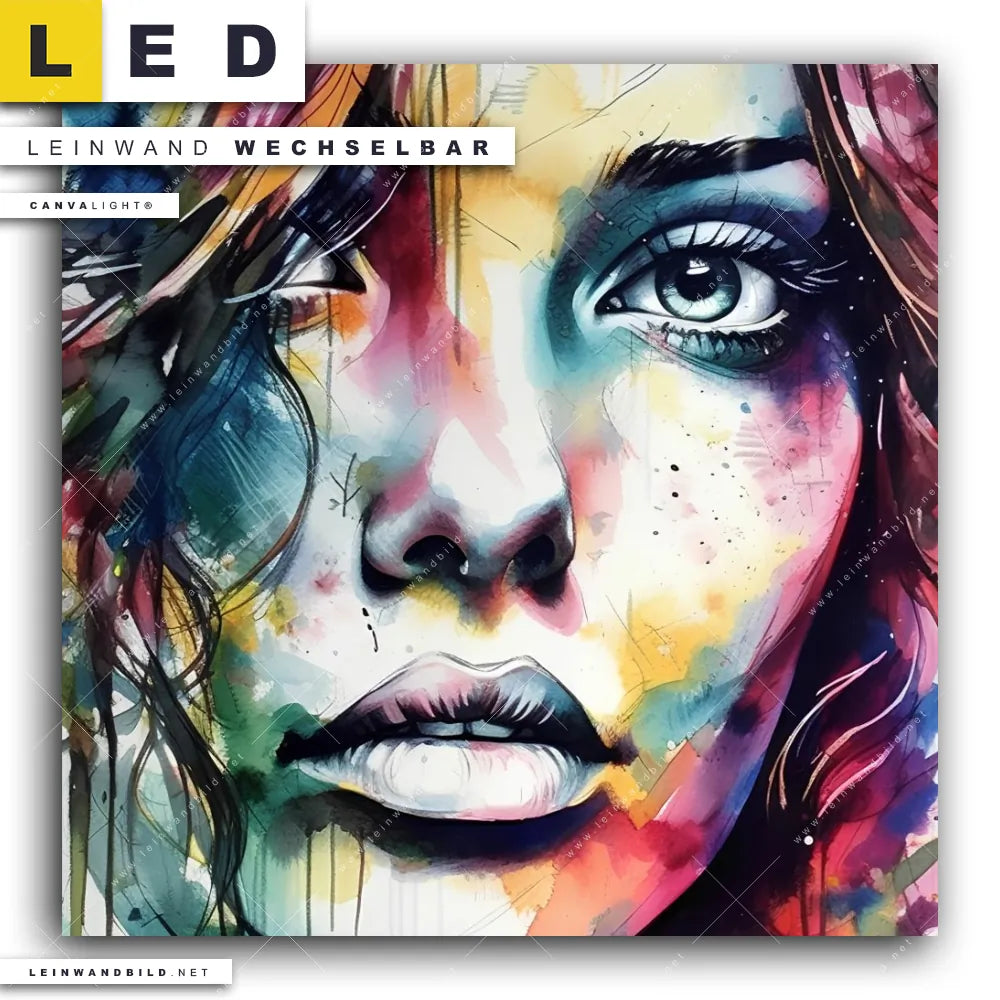 Du bist auf der Suche nach einem Porträts - Menschen LED Leinwandbild im Quadratischen Format? Begriffe wie Frau, Portrait, Gesicht, Mädchen, Dame, Schönheit, Farbe haben Dich auf der Suche nach Deinem neuen XXL LED Wandbild mit wechselbarer Leinwand inspiriert? Farben wie Bunt dürfen auf Deinem neuen Leinwand-LED-Bild nicht fehlen und Leuchtbilder im Abstrakt, Modern Art Stil passen perfekt zu Deinem Einrichtungsstil?