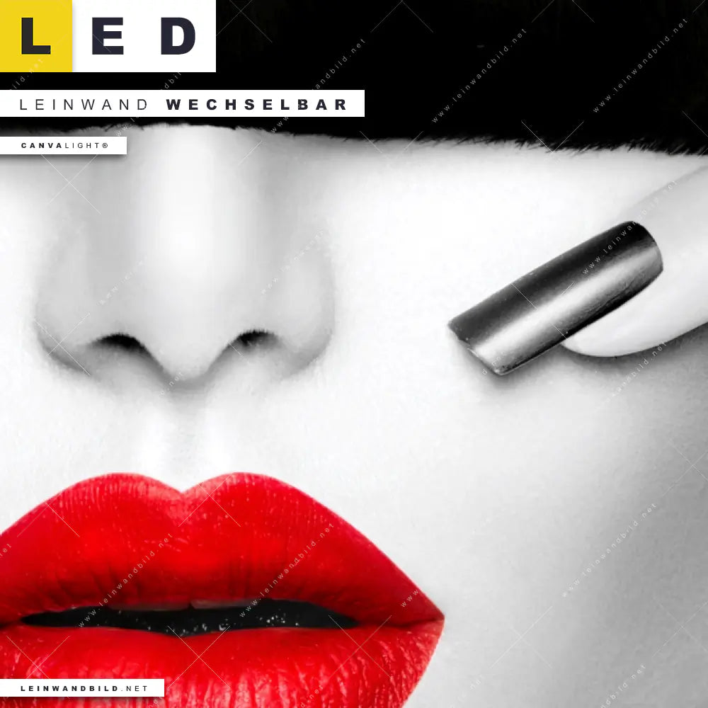 Dann sollte das LED Leinwandbild Canvalight® TEX | Schwarze Eleganz & rote Lippen | Quadrat den Weg zu Dir finden. Das stufenlos dimmbare Leinwandbild Glamour pur in Schwarz-Weiß im steckerfertigen Leuchtrahmen mit Fernbedienung und optionaler Farbtemperatursteuerung fügt sich als Eye-Catcher harmonisch in jedes Bar - Gastronomie, Friseur - Beauty, Wohnzimmer - Schlafzimmer, Flur - Eingangsbereich Raumkonzept ein.