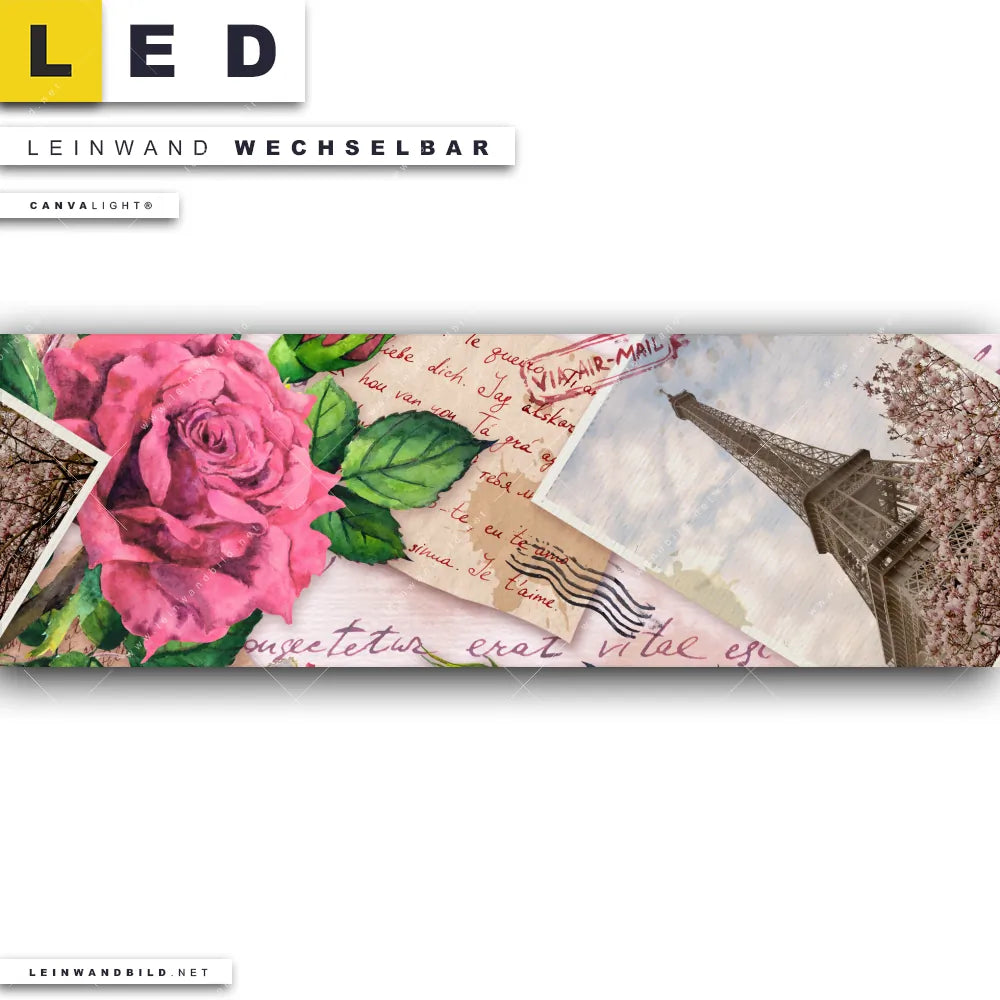 Du bist auf der Suche nach einem Städte - Skylines, Muster - Texturen, Fensterblick, Blumen - Botanik LED Leinwandbild im Panorama-Format? Begriffe wie Pop Art, Mixed Media, Sehenswürdigkeiten, Frankreich, Paris, Eifelturm, Schrift, französisch, Rosen, Federn, Briefmarke haben Dich auf der Suche nach Deinem neuen XXL LED Wandbild mit wechselbarer Leinwand inspiriert? Farben wie Braun, Rot, Grün, Rosa dürfen auf Deinem neuen extra breiten Leinwand-LED-Bild nicht fehlen und Leuchtbilder im Mixed Media, Modern Art Stil passen perfekt zu Deinem Einrichtungsstil?