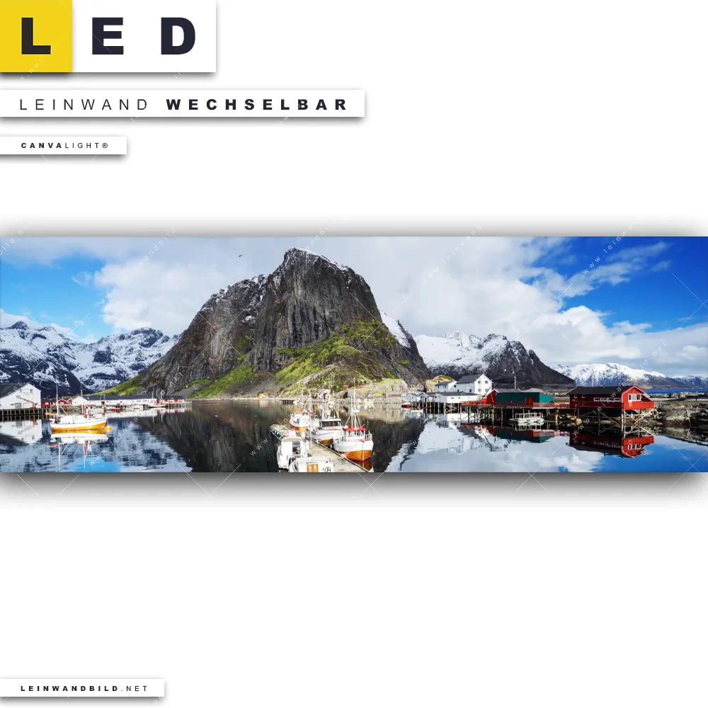 Du bist auf der Suche nach einem Landschaften, Städte - Skylines LED Leinwandbild im Panorama-Format? Begriffe wie Skandinavien, Norwegen, Haus, Boot, Berg, See, Frühling, Natur, Dorf, Steg haben Dich auf der Suche nach Deinem neuen XXL LED Wandbild mit wechselbarer Leinwand inspiriert? Farben wie Blau, Rot, Weiss, Hellgrün dürfen auf Deinem neuen extra breiten Leinwand-LED-Bild nicht fehlen und Leuchtbilder im Natürlich - Realistisch Stil passen perfekt zu Deinem Einrichtungsstil?
