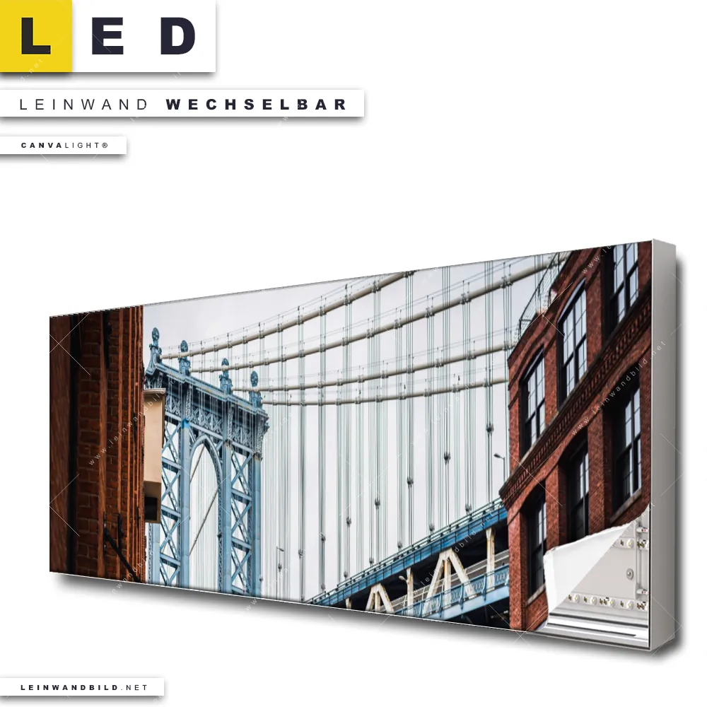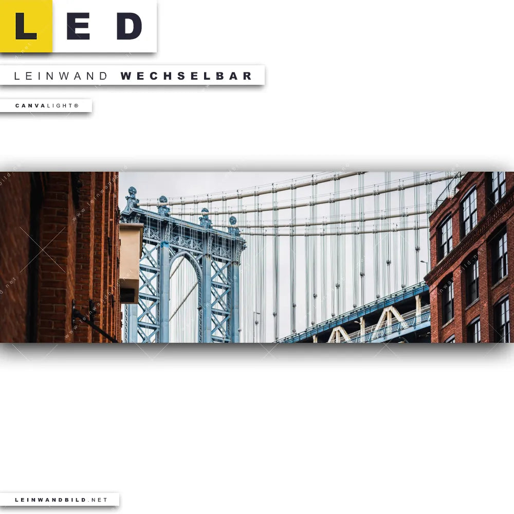 Du bist auf der Suche nach einem Architektur - Gebäude, Städte - Skylines LED Leinwandbild im Panorama-Format? Begriffe wie Brücke, New York City, Skyline, Manhatten, Amerika, New York, USA haben Dich auf der Suche nach Deinem neuen XXL LED Wandbild mit wechselbarer Leinwand inspiriert? Farben wie Braun, Beige, Blau, Hellblau, Ocker, Rot dürfen auf Deinem neuen extra breiten Leinwand-LED-Bild nicht fehlen und Leuchtbilder im Natürlich - Realistisch, Modern Art Stil passen perfekt zu Deinem Einrichtungsstil?