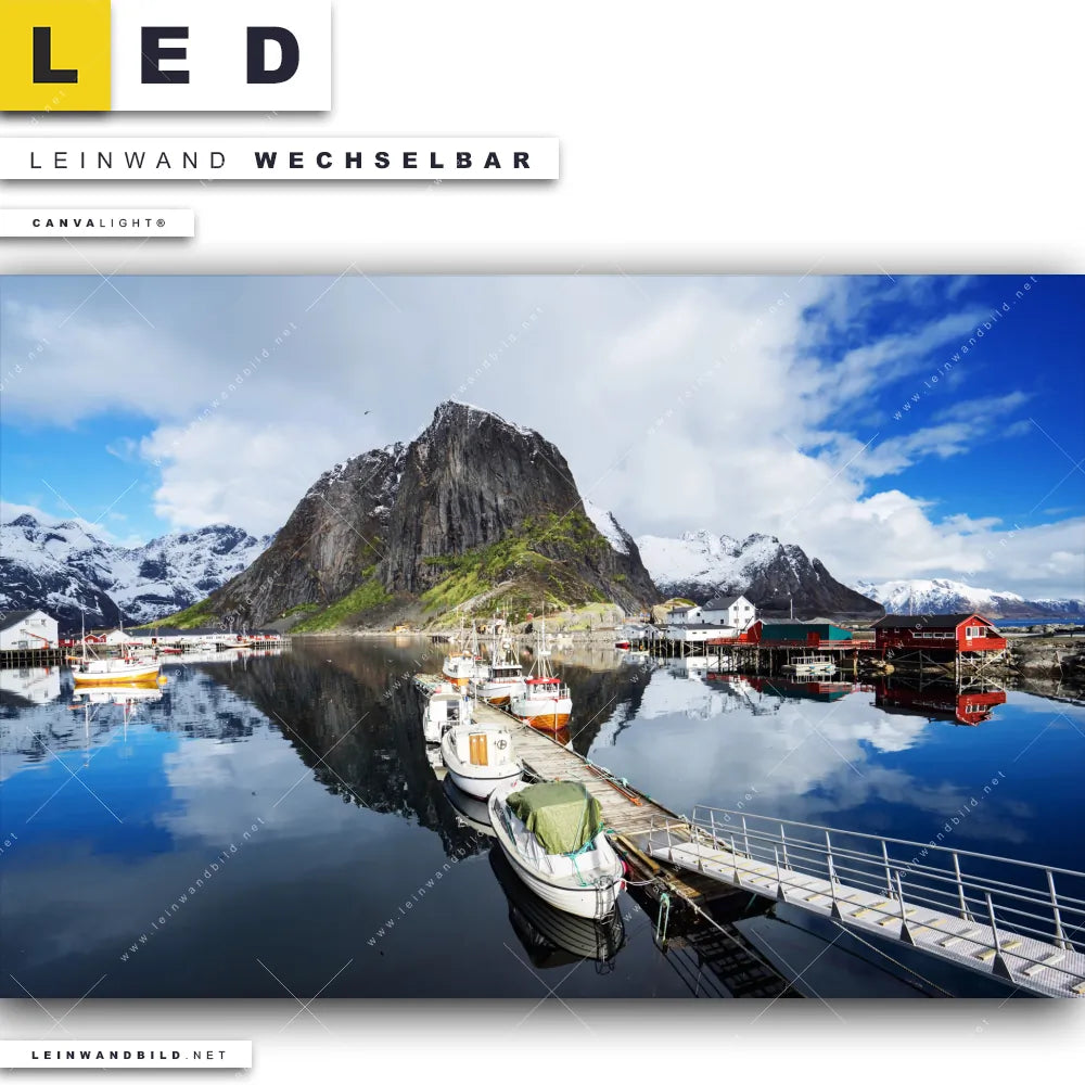 Du bist auf der Suche nach einem Landschaften, Städte - Skylines LED Leinwandbild im Querformat? Begriffe wie Skandinavien, Norwegen, Haus, Boot, Berg, See, Frühling, Natur, Dorf, Steg haben Dich auf der Suche nach Deinem neuen XXL LED Wandbild mit wechselbarer Leinwand inspiriert? Farben wie Blau, Rot, Weiss, Hellgrün dürfen auf Deinem neuen breiten Leinwand-LED-Bild nicht fehlen und Leuchtbilder im Natürlich - Realistisch Stil passen perfekt zu Deinem Einrichtungsstil?