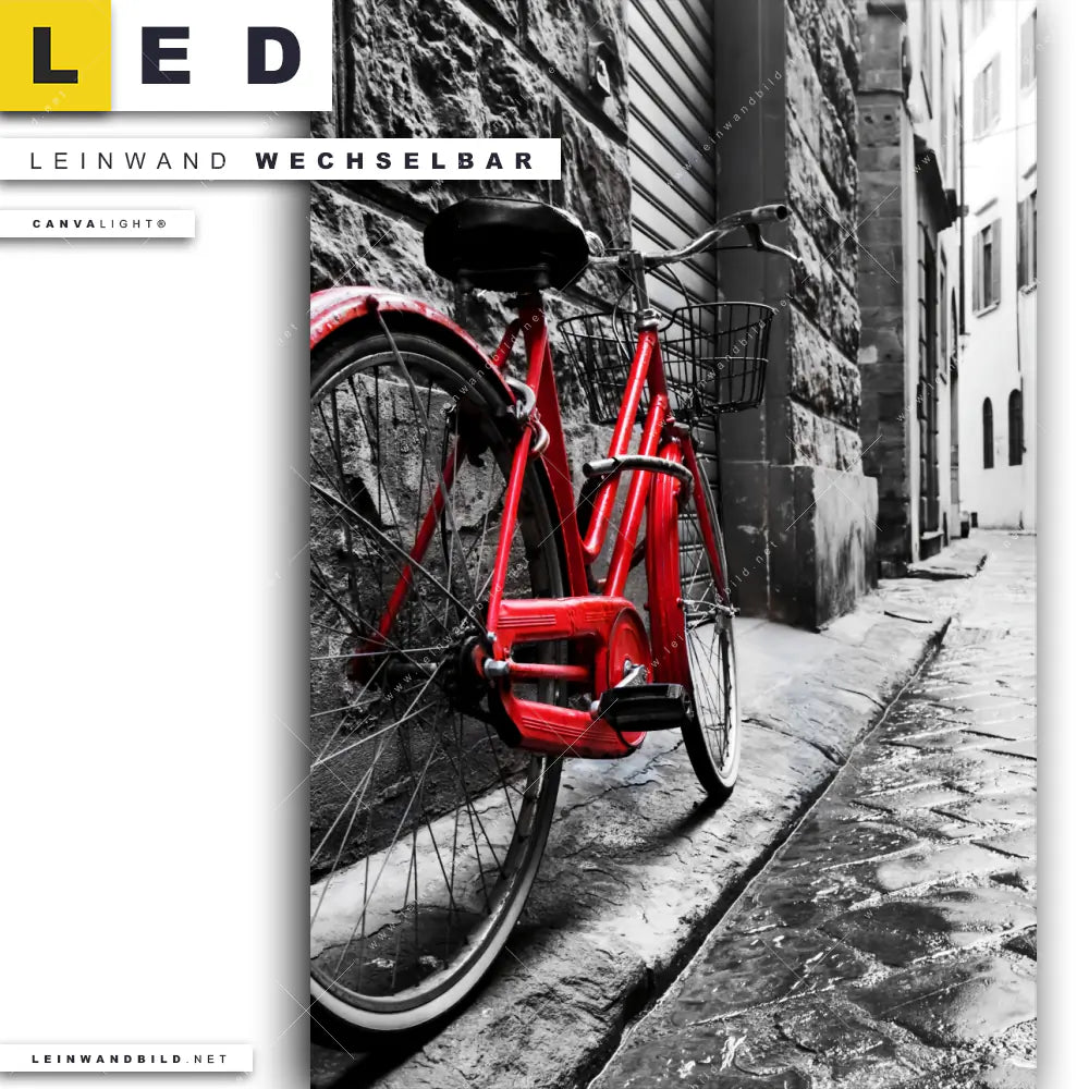 LED Leinwandbild Canvalight® TEX | Rotes Fahrrad in Gasse | Hochformat