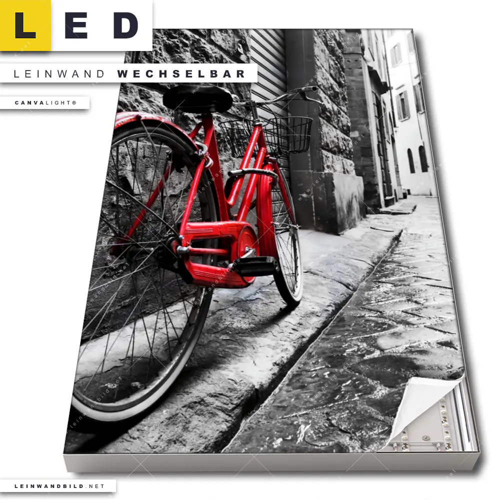 Du konfigurierst Dein individuelles LED Leinwandbild Canvalight® TEX | Rotes Fahrrad in Gasse | Hochformat und wir produzieren es NEU für Dich. Unsere Fahrzeuge, Städte - Skylines LED Bilder mit wechselbarer Textil-Leinwand sind KEINE Lagerware. Du bist Dir unsicher, welches Motiv oder Format das richtige für dein individuelles Canvalight® Leuchtbild ist, dann helfen wir dir gerne weiter und beraten dich!