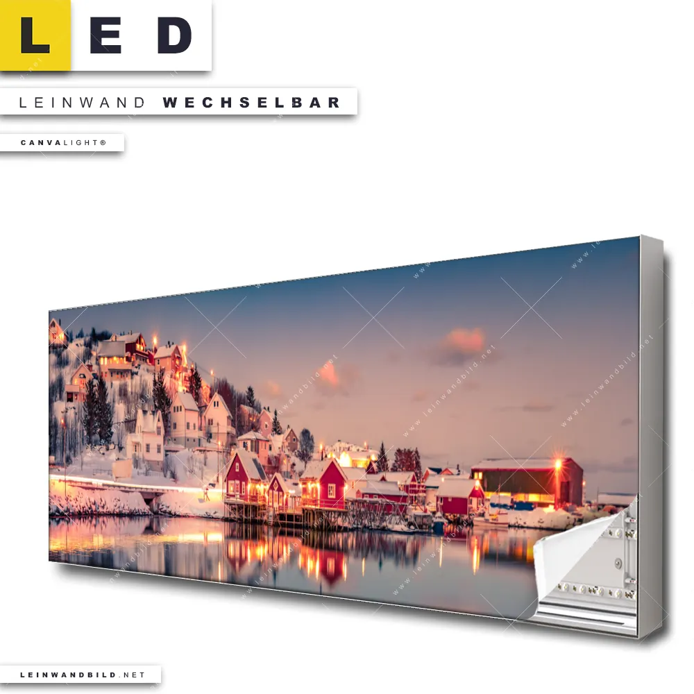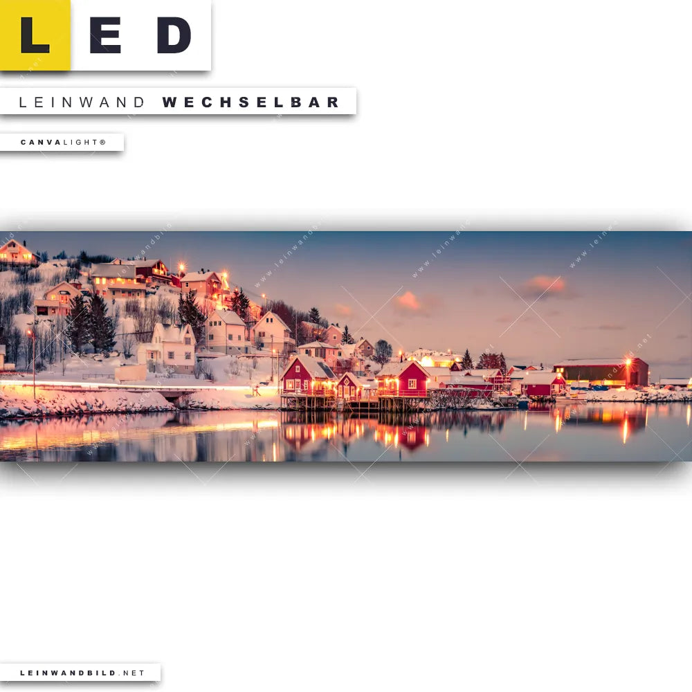 Du bist auf der Suche nach einem Landschaften, Städte - Skylines LED Leinwandbild im Panorama-Format? Begriffe wie Winter, Norwegen, Skandinavien, See, Berg, Haus, Dorf, Sonnenuntergang, Natur haben Dich auf der Suche nach Deinem neuen XXL LED Wandbild mit wechselbarer Leinwand inspiriert? Farben wie Blau, Rot, Weiss dürfen auf Deinem neuen extra breiten Leinwand-LED-Bild nicht fehlen und Leuchtbilder im Natürlich - Realistisch Stil passen perfekt zu Deinem Einrichtungsstil?