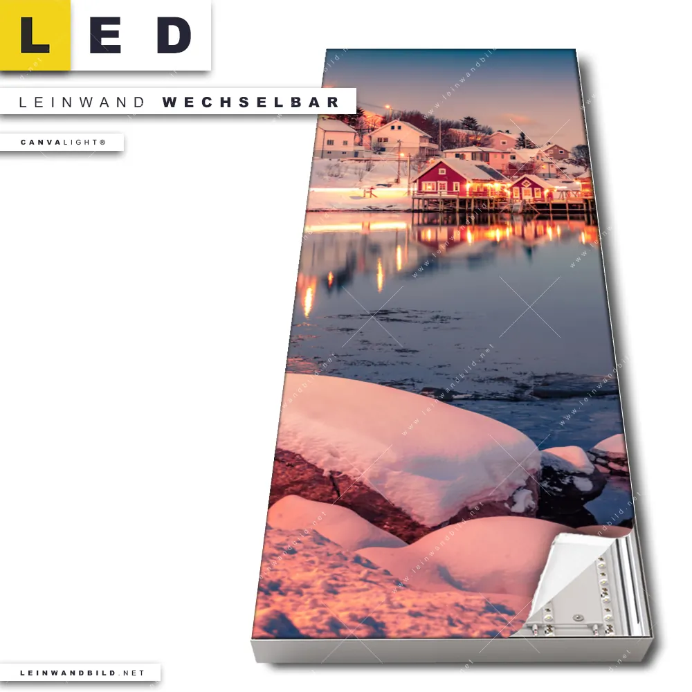 Du bist auf der Suche nach einem Landschaften, Städte - Skylines LED Leinwandbild im Schmalen Format? Begriffe wie Winter, Norwegen, Skandinavien, See, Berg, Haus, Dorf, Sonnenuntergang, Natur haben Dich auf der Suche nach Deinem neuen XXL LED Wandbild mit wechselbarer Leinwand inspiriert? Farben wie Blau, Rot, Weiss dürfen auf Deinem neuen Leinwand-LED-Bild im Panorama-Hochformat nicht fehlen und Leuchtbilder im Natürlich - Realistisch Stil passen perfekt zu Deinem Einrichtungsstil?