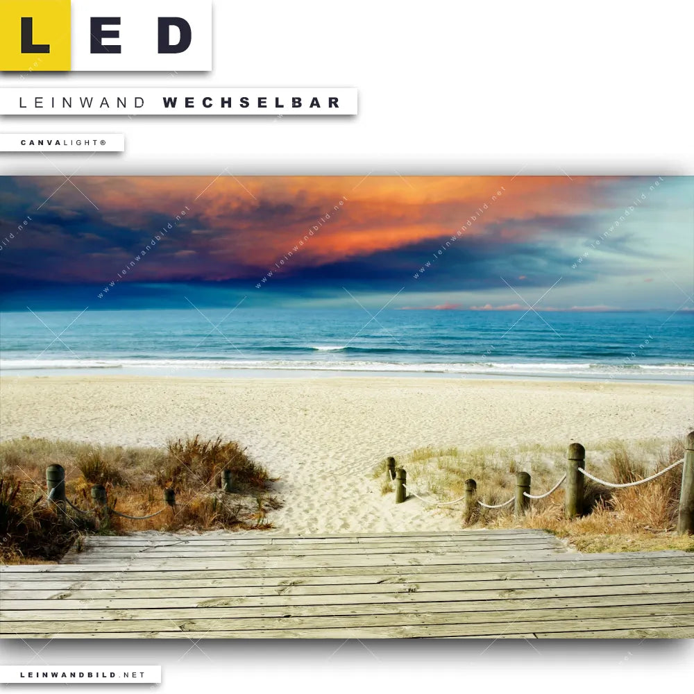 Du bist auf der Suche nach einem Landschaften, Strand - Meer LED Leinwandbild im Querformat? Begriffe wie Meer, Sonnenuntergang, Strand, Treppe, Weg, Herbst haben Dich auf der Suche nach Deinem neuen XXL LED Wandbild mit wechselbarer Leinwand inspiriert? Farben wie Blau, Orange, Beige dürfen auf Deinem neuen breiten Leinwand-LED-Bild nicht fehlen und Leuchtbilder im Natürlich - Realistisch Stil passen perfekt zu Deinem Einrichtungsstil?