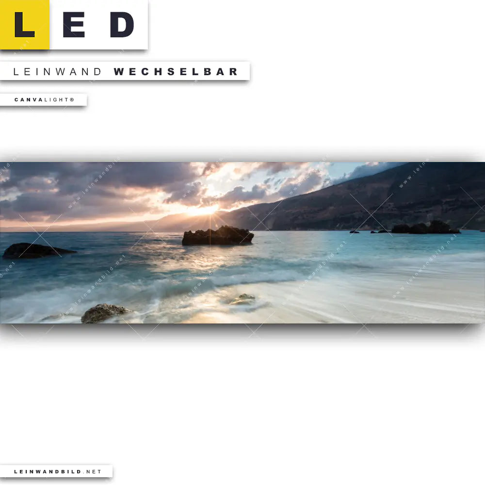 Du bist auf der Suche nach einem Landschaften, Strand - Meer LED Leinwandbild im Panorama-Format? Begriffe wie Sommer, Ostsee, Nordsee, Sonnenuntergang, Sonnenaufgang, Natur, Urlaub, Reisen, Meer, Strand, Insel, Steine, Felsen haben Dich auf der Suche nach Deinem neuen XXL LED Wandbild mit wechselbarer Leinwand inspiriert? Farben wie Beige, Blau, Türkis dürfen auf Deinem neuen extra breiten Leinwand-LED-Bild nicht fehlen und Leuchtbilder im Natürlich - Realistisch Stil passen perfekt zu Deinem Einrichtungsstil?