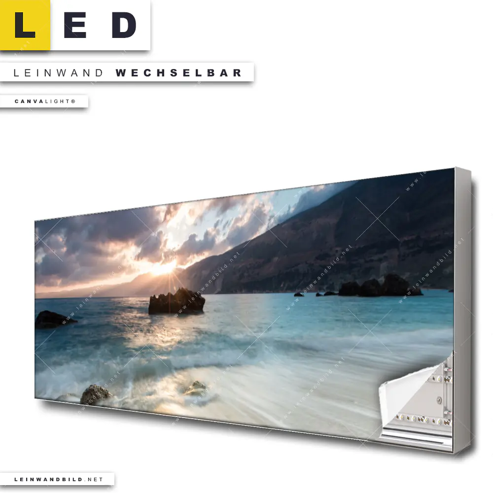 Du konfigurierst Dein individuelles LED Leinwandbild Canvalight® TEX | Meeresrauschen bei Sonnenuntergang | Panorama und wir produzieren es NEU für Dich. Unsere Landschaften, Strand - Meer LED Bilder mit wechselbarer Textil-Leinwand sind KEINE Lagerware. Du bist Dir unsicher, welches Motiv oder Format das richtige für dein individuelles Canvalight® Leuchtbild ist, dann helfen wir dir gerne weiter und beraten dich!