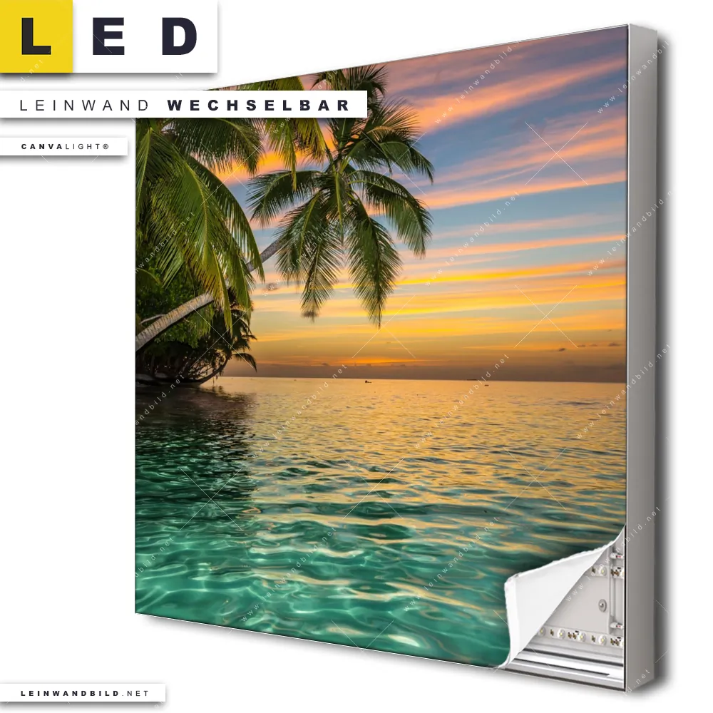 Du bist auf der Suche nach einem Landschaften, Strand - Meer LED Leinwandbild im Quadratischen Format? Begriffe wie Palmen, Horizont, Ozean, Insel, Meer, Sommer, Südsee - Karibik, Urlaub - Reisen, Sonnenuntergang - Sonnenaufgang haben Dich auf der Suche nach Deinem neuen XXL LED Wandbild mit wechselbarer Leinwand inspiriert? Farben wie Orange, Grün, Blau dürfen auf Deinem neuen Leinwand-LED-Bild nicht fehlen und Leuchtbilder im Retro - Vintage, Natürlich - Realistisch Stil passen perfekt zu Deinem Einrichtungsstil?