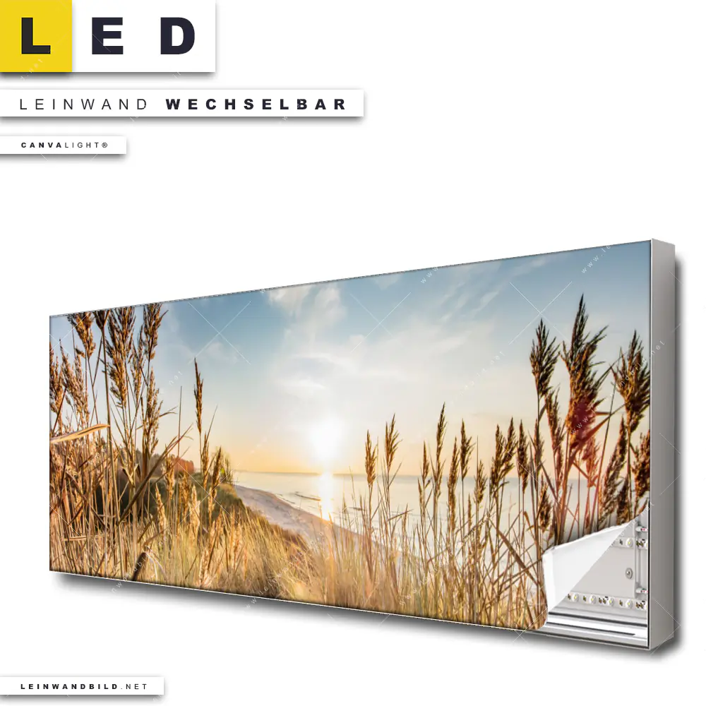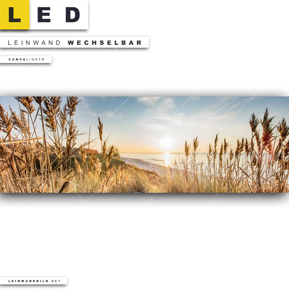 Du bist auf der Suche nach einem Landschaften, Strand - Meer LED Leinwandbild im Panorama-Format? Begriffe wie Deutschland, Sommer, Dünen, Gräser, Urlaub, Reisen, Ostsee, Nordsee, Strand, Meer, Sonnenuntergang, Sonnenaufgang haben Dich auf der Suche nach Deinem neuen XXL LED Wandbild mit wechselbarer Leinwand inspiriert? Farben wie Beige, Blau, Braun dürfen auf Deinem neuen extra breiten Leinwand-LED-Bild nicht fehlen und Leuchtbilder im Retro - Vintage, Natürlich - Realistisch Stil passen perfekt zu Deinem Einrichtungsstil?