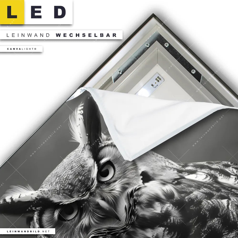 Du konfigurierst Dein individuelles LED Leinwandbild Canvalight® TEX | Düstere Eleganz der Eule | Hochformat und wir produzieren es NEU für Dich. Unsere Tierwelt LED Bilder mit wechselbarer Textil-Leinwand sind KEINE Lagerware. Du bist Dir unsicher, welches Motiv oder Format das richtige für dein individuelles Canvalight® Leuchtbild ist, dann helfen wir dir gerne weiter und beraten dich!