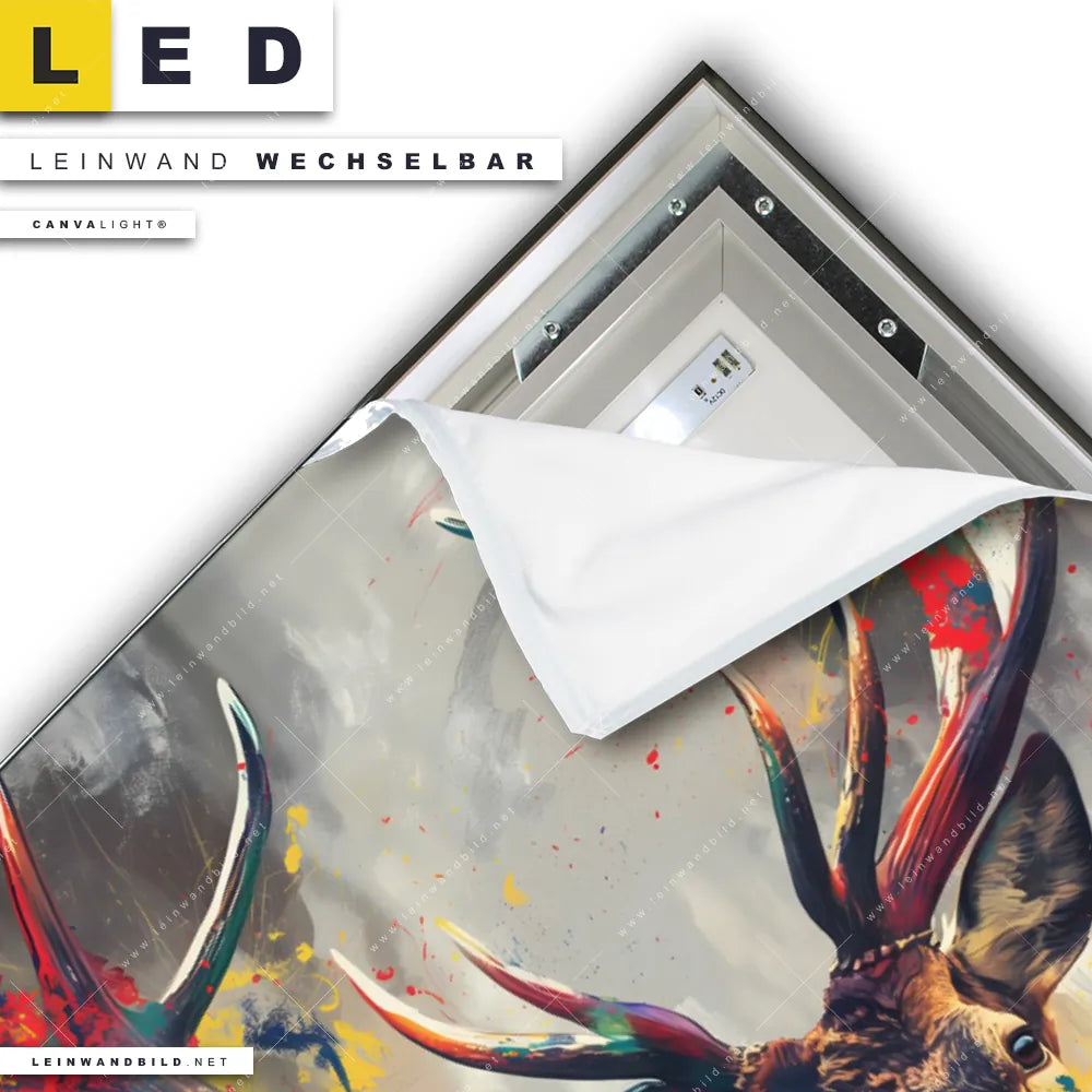 Du konfigurierst Dein individuelles LED Leinwandbild Canvalight® TEX | Kreativer Hirsch mit Farbspritzern | Hochformat und wir produzieren es NEU für Dich. Unsere Tierwelt LED Bilder mit wechselbarer Textil-Leinwand sind KEINE Lagerware. Du bist Dir unsicher, welches Motiv oder Format das richtige für dein individuelles Canvalight® Leuchtbild ist, dann helfen wir dir gerne weiter und beraten dich!