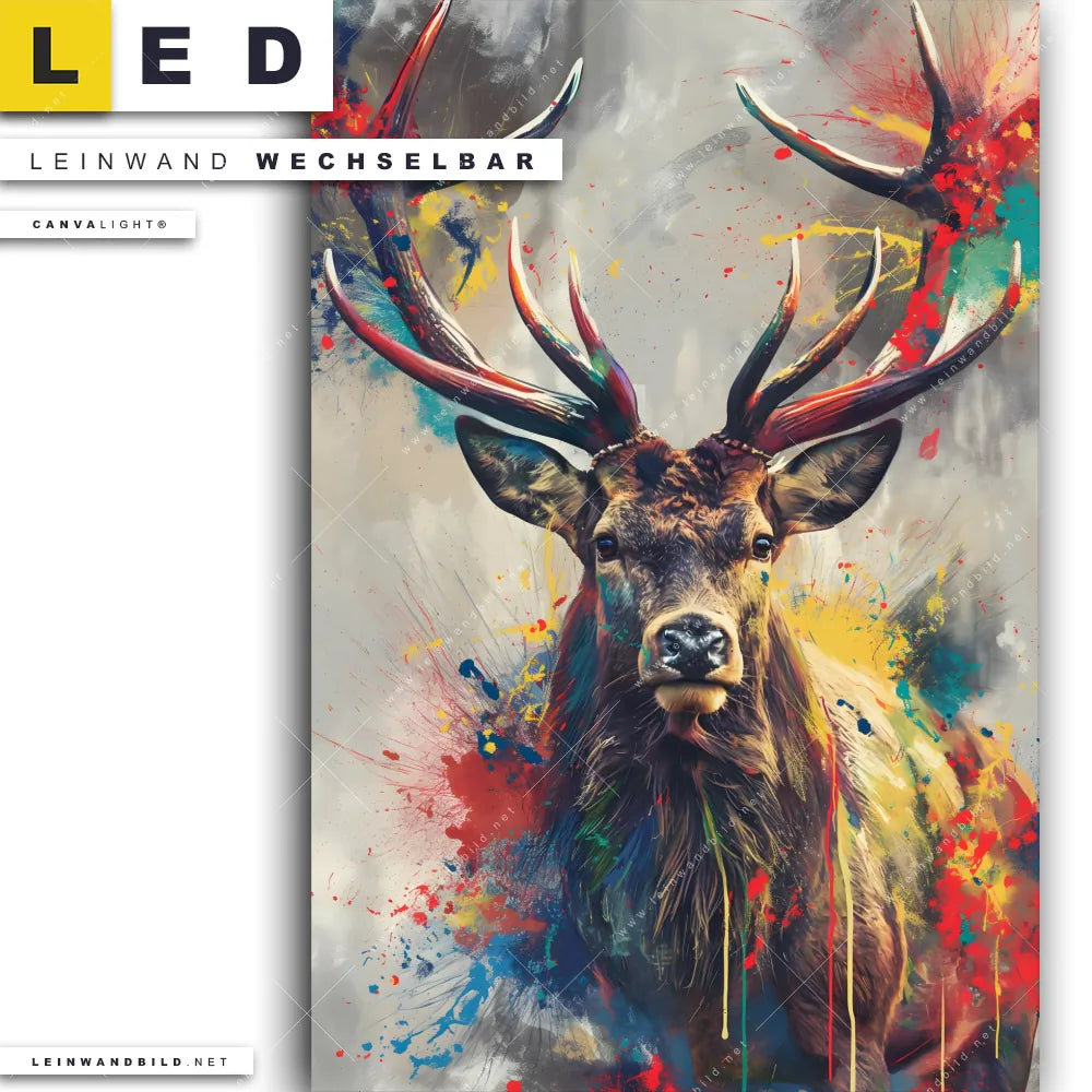 LED Leinwandbild Canvalight® TEX | Kreativer Hirsch mit Farbspritzern | Hochformat