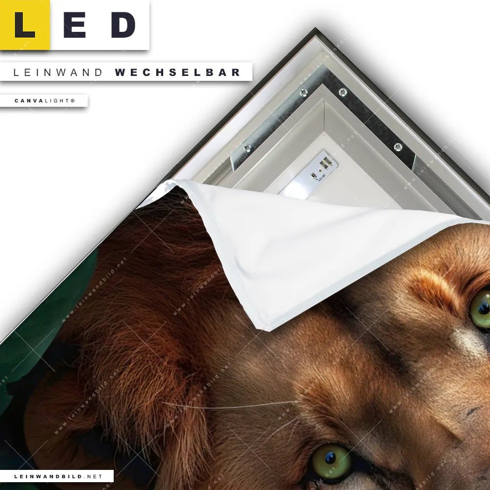 Du konfigurierst Dein individuelles LED Leinwandbild Canvalight® TEX | Löwe im grünen Regenwald | Hochformat und wir produzieren es NEU für Dich. Unsere Tierwelt, Blumen - Botanik LED Bilder mit wechselbarer Textil-Leinwand sind KEINE Lagerware. Du bist Dir unsicher, welches Motiv oder Format das richtige für dein individuelles Canvalight® Leuchtbild ist, dann helfen wir dir gerne weiter und beraten dich!