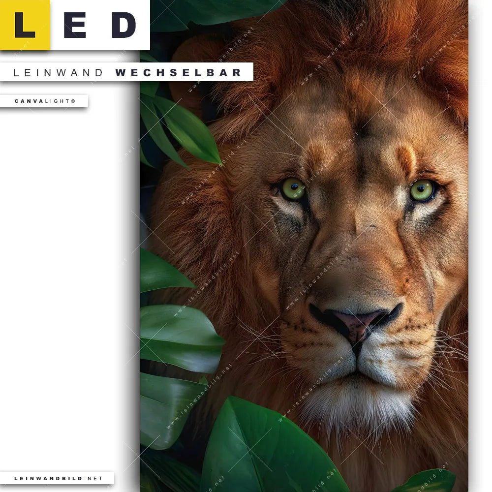 LED Leinwandbild Canvalight® TEX | Löwe im grünen Regenwald | Hochformat