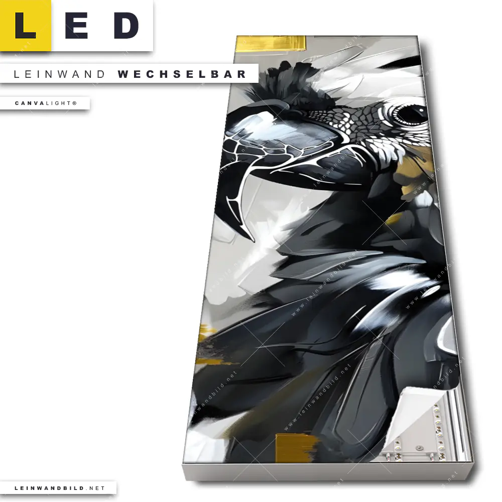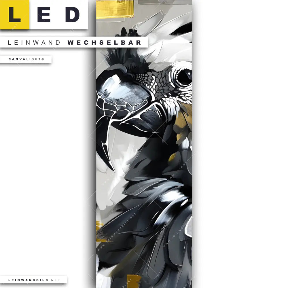 Du bist auf der Suche nach einem Tierwelt LED Leinwandbild im Schmalen Format? Begriffe wie Vogel, Papagei, Federn, Textur, Farbspritzer haben Dich auf der Suche nach Deinem neuen XXL LED Wandbild mit wechselbarer Leinwand inspiriert? Farben wie Weiss, Grau , Schwarz, Gold dürfen auf Deinem neuen Leinwand-LED-Bild im Panorama-Hochformat nicht fehlen und Leuchtbilder im Abstrakt, Modern Art, Schwarz - Weiss Stil passen perfekt zu Deinem Einrichtungsstil?