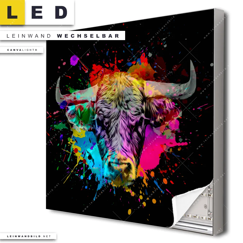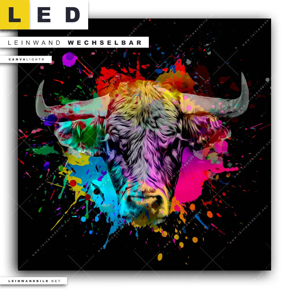 Du bist auf der Suche nach einem Tierwelt LED Leinwandbild im Quadratischen Format? Begriffe wie Tier, Stier, Hochlandkuh, Highlander, Büffel, Splash, Farbspritzer, Rind haben Dich auf der Suche nach Deinem neuen XXL LED Wandbild mit wechselbarer Leinwand inspiriert? Farben wie Bunt, Schwarz dürfen auf Deinem neuen Leinwand-LED-Bild nicht fehlen und Leuchtbilder im Abstrakt, Modern Art, Pop Art Stil passen perfekt zu Deinem Einrichtungsstil?