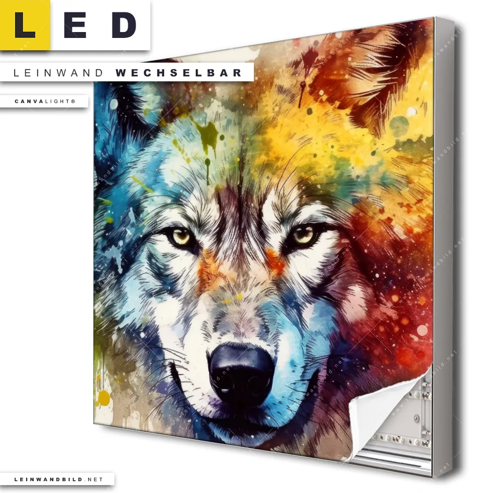 LED Leinwandbild Canvalight® TEX | Wolf mit bunten Farbspritzern No. 2 | Quadrat