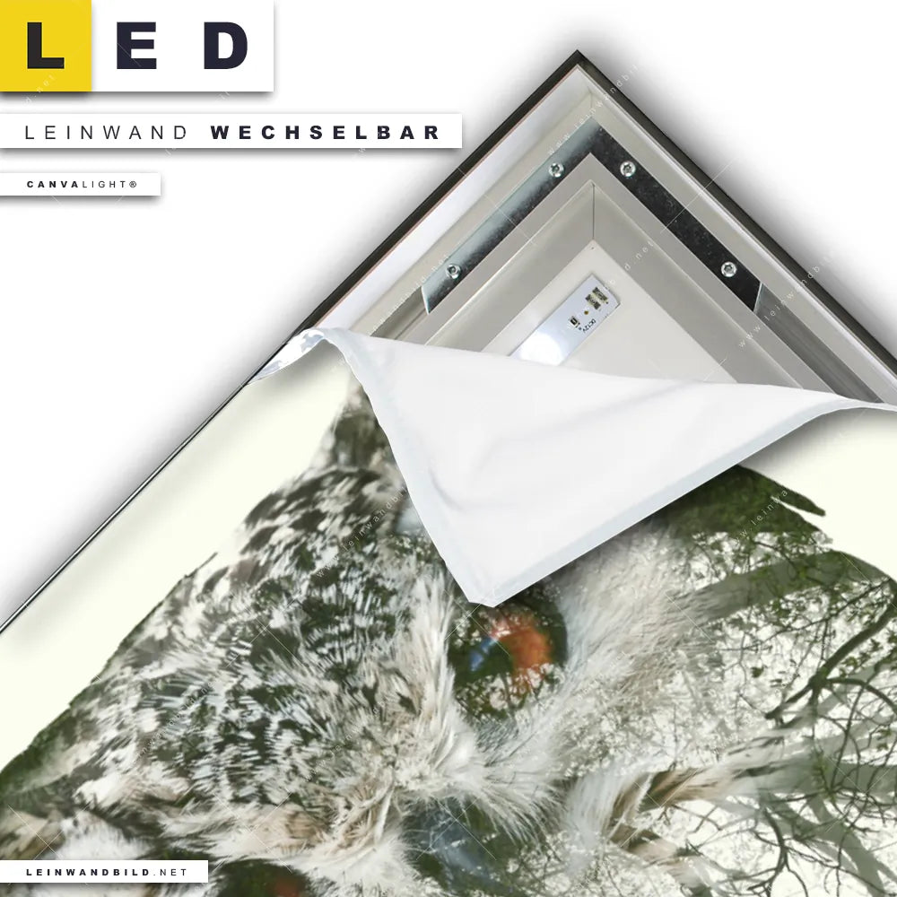 Du konfigurierst Dein individuelles LED Leinwandbild Canvalight® TEX | Eule & Wald No.1 | Querformat und wir produzieren es NEU für Dich. Unsere Tierwelt LED Bilder mit wechselbarer Textil-Leinwand sind KEINE Lagerware. Du bist Dir unsicher, welches Motiv oder Format das richtige für dein individuelles Canvalight® Leuchtbild ist, dann helfen wir dir gerne weiter und beraten dich!
