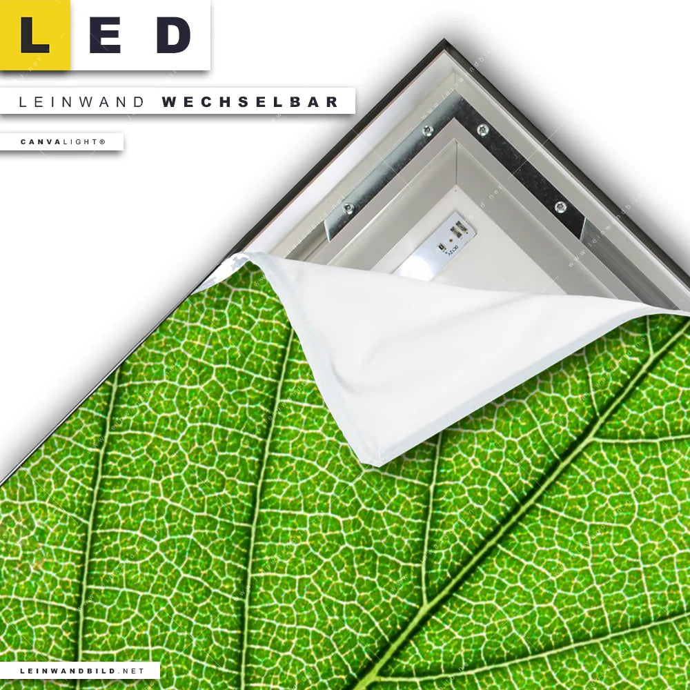 Du konfigurierst Dein individuelles LED Leinwandbild Canvalight® TEX | Grüne Blattadern | Querformat und wir produzieren es NEU für Dich. Unsere Blumen - Botanik, Wald - Bäume LED Bilder mit wechselbarer Textil-Leinwand sind KEINE Lagerware. Du bist Dir unsicher, welches Motiv oder Format das richtige für dein individuelles Canvalight® Leuchtbild ist, dann helfen wir dir gerne weiter und beraten dich!