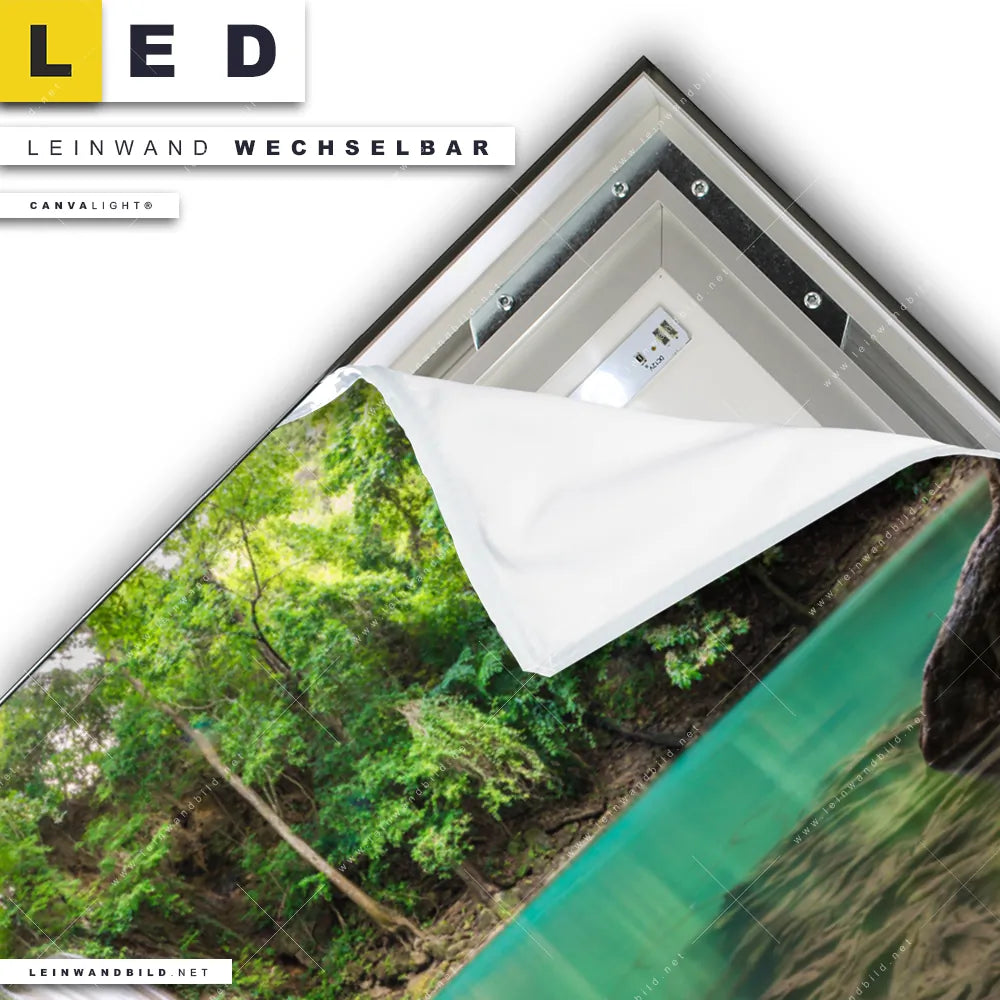 Du konfigurierst Dein individuelles LED Leinwandbild Canvalight® TEX | Wald & Wasserfall No. 4 | Querformat und wir produzieren es NEU für Dich. Unsere Landschaften LED Bilder mit wechselbarer Textil-Leinwand sind KEINE Lagerware. Du bist Dir unsicher, welches Motiv oder Format das richtige für dein individuelles Canvalight® Leuchtbild ist, dann helfen wir dir gerne weiter und beraten dich!