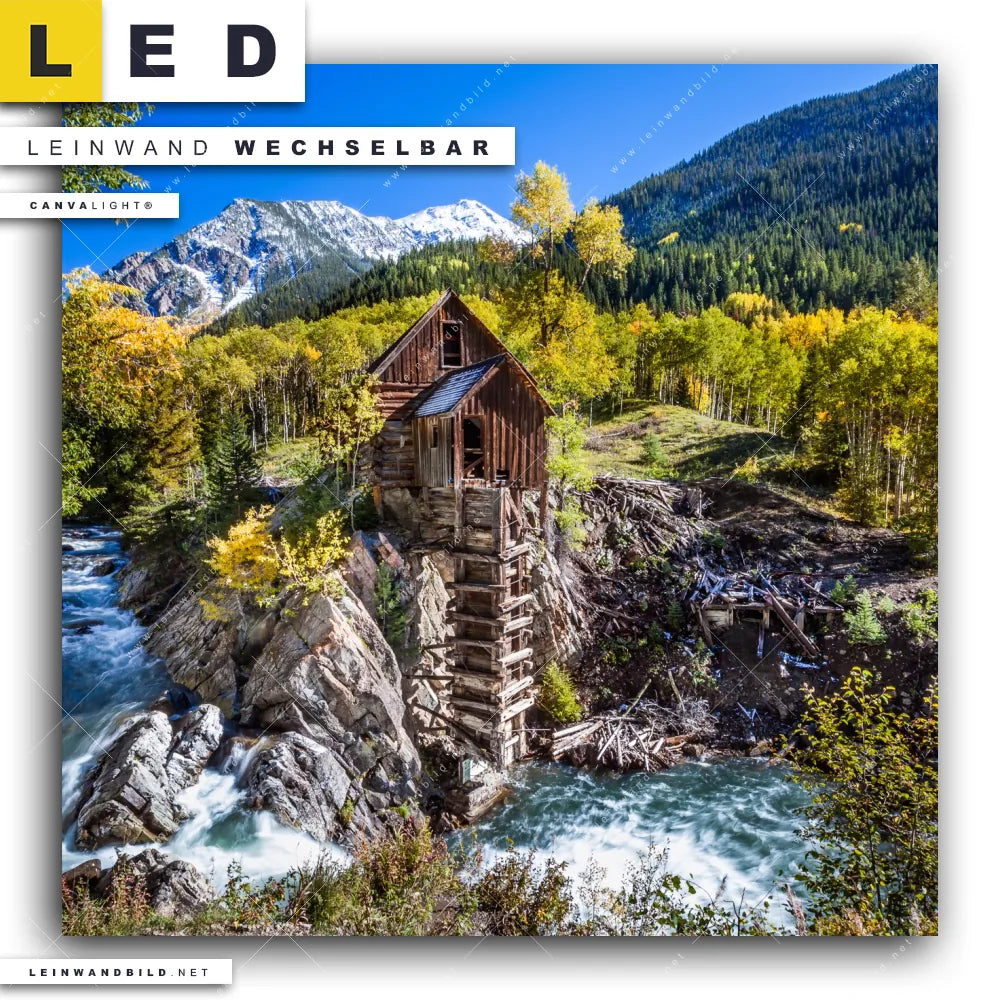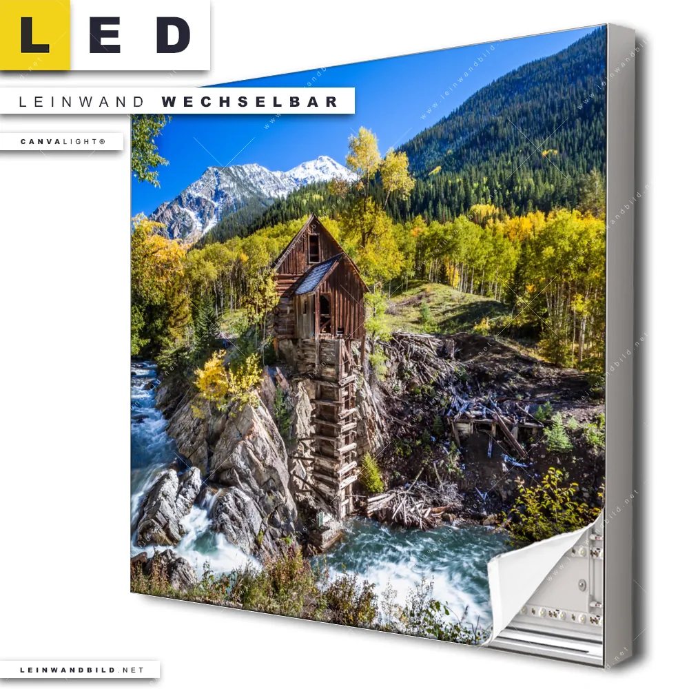 Dann sollte das LED Leinwandbild Canvalight® TEX | Waldhütte am Fluss | Quadrat den Weg zu Dir finden. Das stufenlos dimmbare Leinwandbild historische Waldhütte in Colorado im steckerfertigen Leuchtrahmen mit Fernbedienung und optionaler Farbtemperatursteuerung fügt sich als Eye-Catcher harmonisch in jedes Arzt - Praxis, Büro - Kanzlei, Flur - Eingangsbereich, Wohnzimmer - Schlafzimmer Raumkonzept ein.