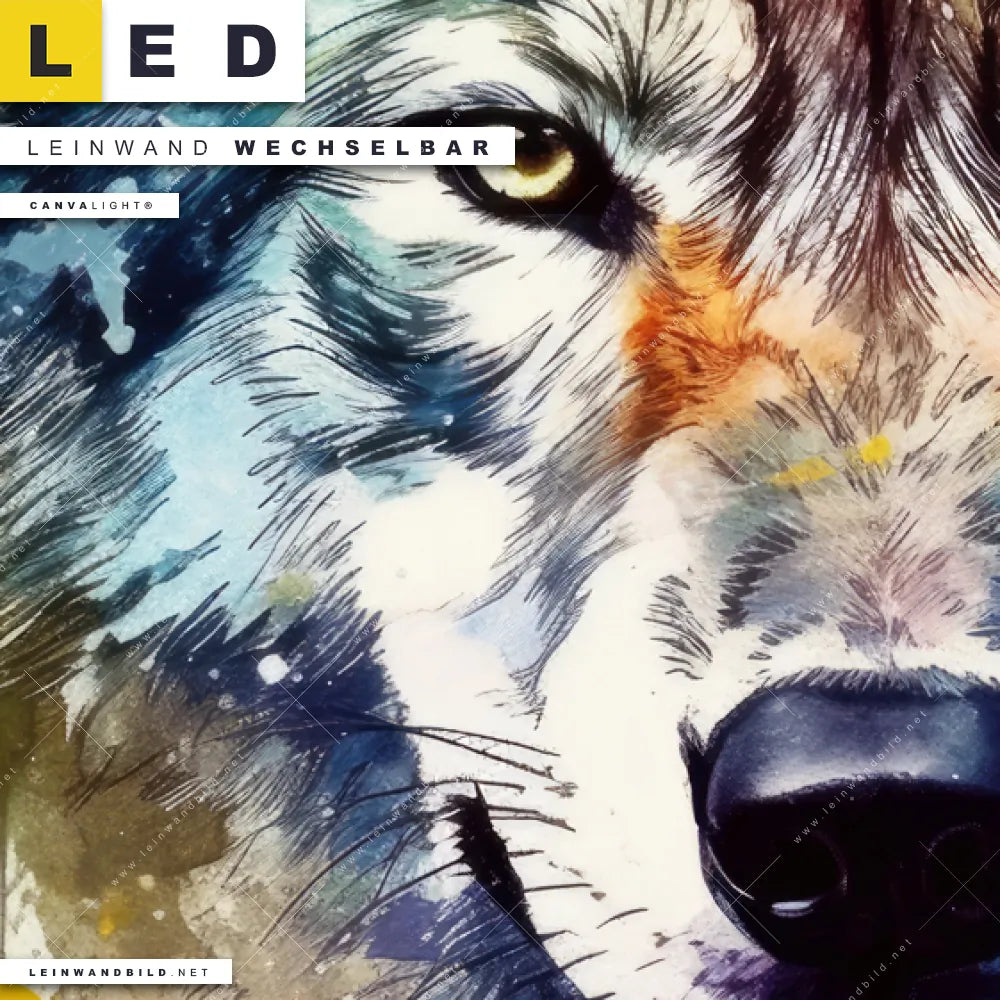 LED Leinwandbild Canvalight® TEX | Wolf mit bunten Farbspritzern No. 2 | Panorama