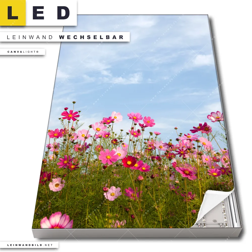 Dann sollte das LED Leinwandbild Canvalight® TEX | Blumenwiese bei strahlend blauem Himmel | Hochformat den Weg zu Dir finden. Das stufenlos dimmbare Leinwandbild Kosmosblumen im Garten im steckerfertigen Leuchtrahmen mit Fernbedienung und optionaler Farbtemperatursteuerung fügt sich als Eye-Catcher harmonisch in jedes Arzt - Praxis, Wohnzimmer - Schlafzimmer, Flur - Eingangsbereich Raumkonzept ein.