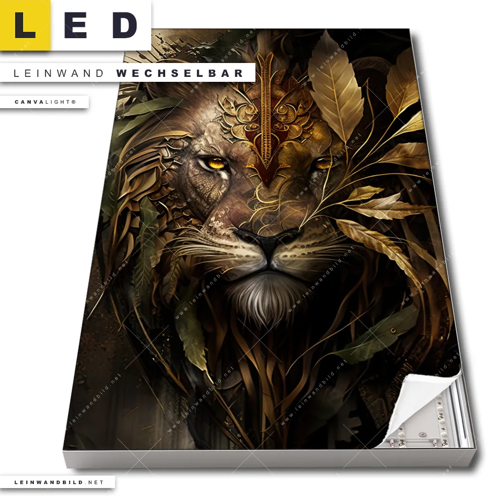 Du bist auf der Suche nach einem Tierwelt LED Leinwandbild im Hochformat? Begriffe wie Raubkatze, Löwe, Afrika, Dschungel, Blätter, Porträt haben Dich auf der Suche nach Deinem neuen XXL LED Wandbild mit wechselbarer Leinwand inspiriert? Farben wie Schwarz, Gold, Beige dürfen auf Deinem neuen Leinwand-LED-Bild nicht fehlen und Leuchtbilder im Surreal - Fantasy, Modern Art Stil passen perfekt zu Deinem Einrichtungsstil?