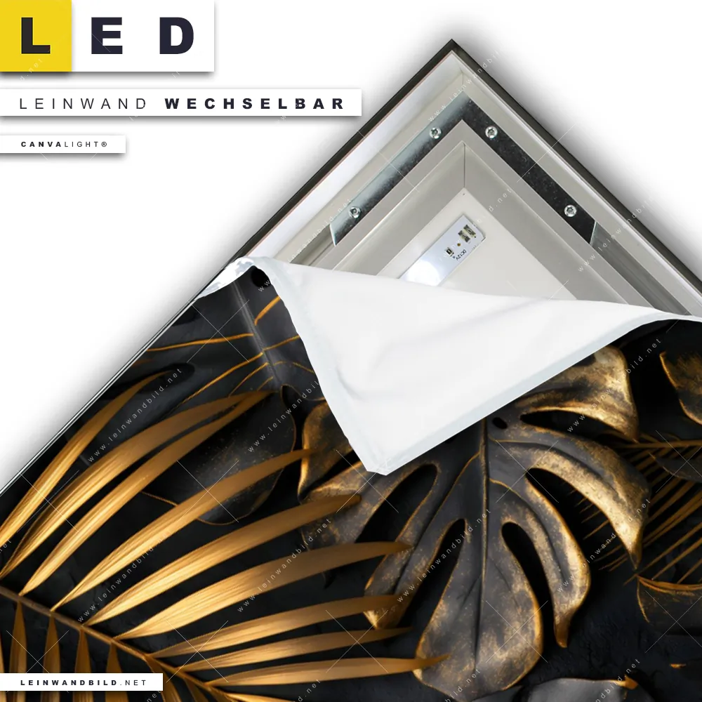 Du konfigurierst Dein individuelles LED Leinwandbild Canvalight® TEX | Palmenblätter Schwarz Gold | Hochformat und wir produzieren es NEU für Dich. Unsere Muster - Texturen, Blumen - Botanik LED Bilder mit wechselbarer Textil-Leinwand sind KEINE Lagerware. Du bist Dir unsicher, welches Motiv oder Format das richtige für dein individuelles Canvalight® Leuchtbild ist, dann helfen wir dir gerne weiter und beraten dich!