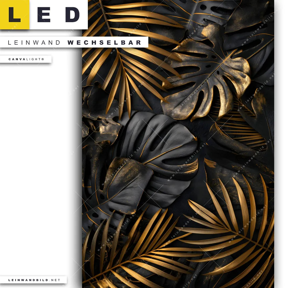Du bist auf der Suche nach einem Muster - Texturen, Blumen - Botanik LED Leinwandbild im Hochformat? Begriffe wie Blätter, Pflanze, Natur, Nahaufnahme, Laub, Dschungel, Monstera, Palmenblätter haben Dich auf der Suche nach Deinem neuen XXL LED Wandbild mit wechselbarer Leinwand inspiriert? Farben wie Schwarz, Gold dürfen auf Deinem neuen Leinwand-LED-Bild nicht fehlen und Leuchtbilder im Floral, Modern Art Stil passen perfekt zu Deinem Einrichtungsstil?