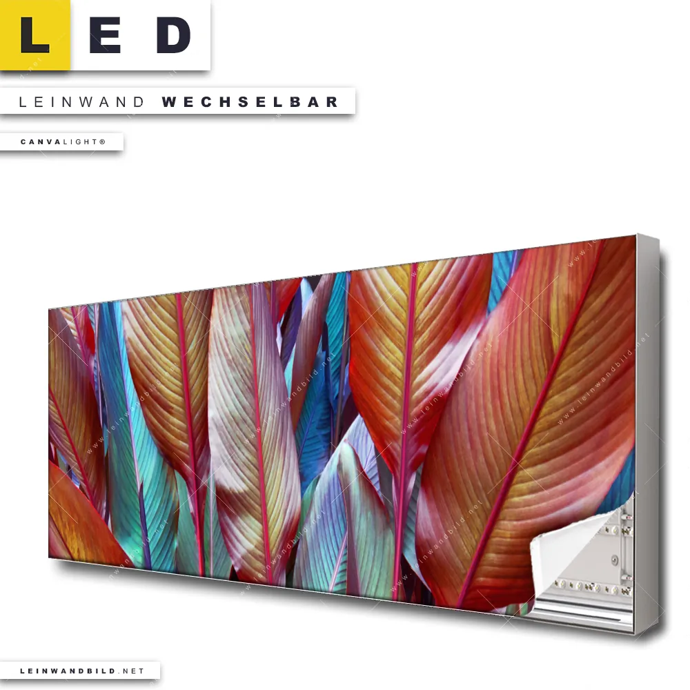 Du bist auf der Suche nach einem Muster - Texturen, Blumen - Botanik LED Leinwandbild im Panorama-Format? Begriffe wie Blätter, Pflanze, Natur, Nahaufnahme, Blatt, Laub, Dschungel haben Dich auf der Suche nach Deinem neuen XXL LED Wandbild mit wechselbarer Leinwand inspiriert? Farben wie Rot, Grün, Mint, Orange dürfen auf Deinem neuen extra breiten Leinwand-LED-Bild nicht fehlen und Leuchtbilder im Floral, Modern Art Stil passen perfekt zu Deinem Einrichtungsstil?