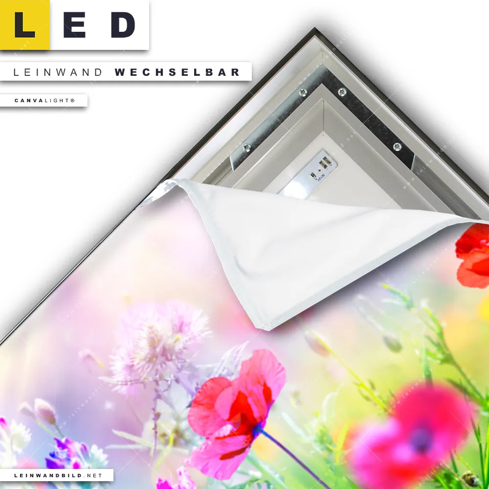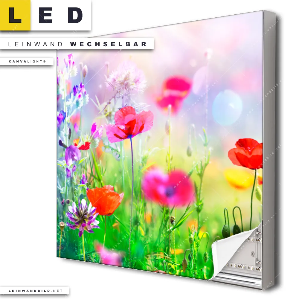 Du konfigurierst Dein individuelles LED Leinwandbild Canvalight® TEX | Bunte Mohnblumen | Quadrat und wir produzieren es NEU für Dich. Unsere Landschaften, Blumen - Botanik LED Bilder mit wechselbarer Textil-Leinwand sind KEINE Lagerware. Du bist Dir unsicher, welches Motiv oder Format das richtige für dein individuelles Canvalight® Leuchtbild ist, dann helfen wir dir gerne weiter und beraten dich!