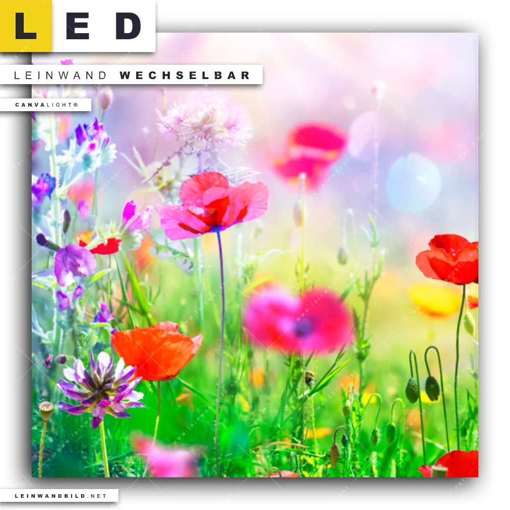 Du bist auf der Suche nach einem Landschaften, Blumen - Botanik LED Leinwandbild im Quadratischen Format? Begriffe wie Blume, Botanik, Pflanze, Natur, Mohn, Mohnblume, Wiese, Feld, Blüte, Blumen haben Dich auf der Suche nach Deinem neuen XXL LED Wandbild mit wechselbarer Leinwand inspiriert? Farben wie Grün, Rot, Pink, Lila dürfen auf Deinem neuen Leinwand-LED-Bild nicht fehlen und Leuchtbilder im Floral, Natürlich - Realistisch Stil passen perfekt zu Deinem Einrichtungsstil?