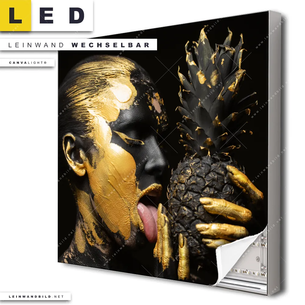 Du bist auf der Suche nach einem Porträts - Menschen LED Leinwandbild im Quadratischen Format? Begriffe wie Frau, Lippen, Mund, Ananas, Früchte, Gesicht, Körper, Beauty, Make-up, Gold haben Dich auf der Suche nach Deinem neuen XXL LED Wandbild mit wechselbarer Leinwand inspiriert? Farben wie Gold, Schwarz dürfen auf Deinem neuen Leinwand-LED-Bild nicht fehlen und Leuchtbilder im Modern Art, Grunge, Mixed Media Stil passen perfekt zu Deinem Einrichtungsstil?
